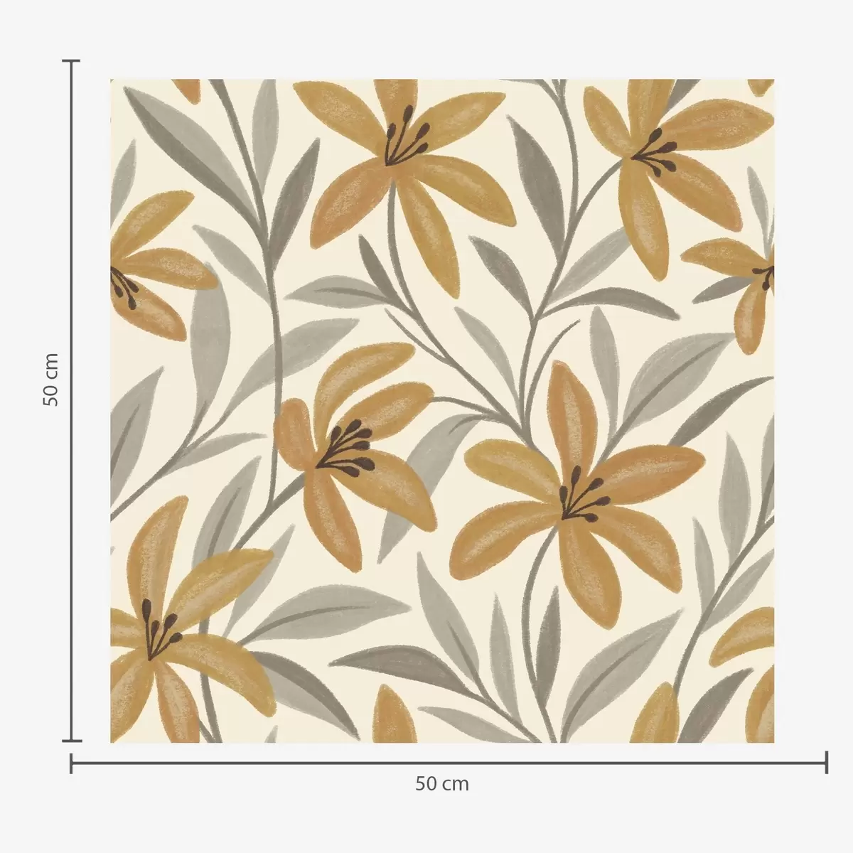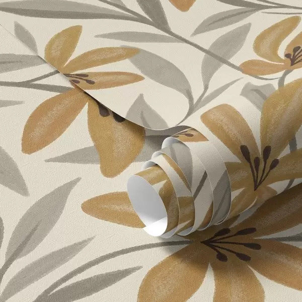 Papel tapiz Lirios amarillos y hojas gris verdosas sobre fondo claro Nr. a00757