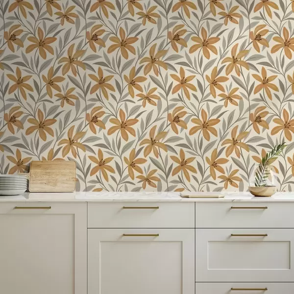 Papel tapiz Lirios amarillos y hojas gris verdosas sobre fondo claro Nr. a00757