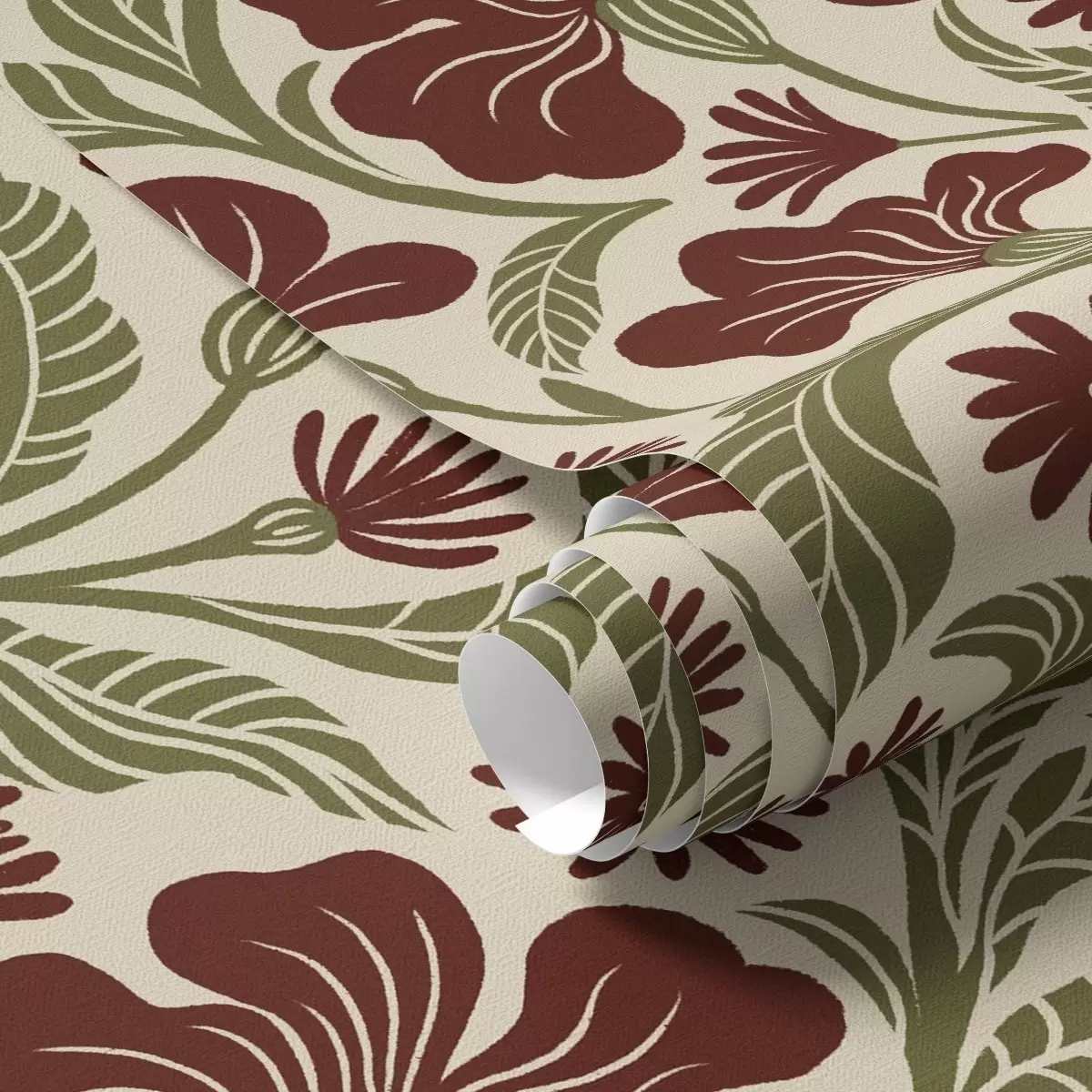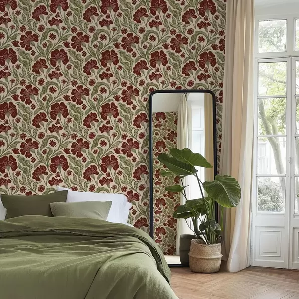 Papel tapiz Flores de color burdeos con hojas verdes sobre fondo claro Nr. a00761
