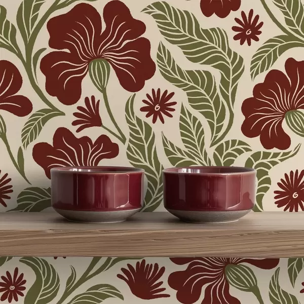 Papel tapiz Flores de color burdeos con hojas verdes sobre fondo claro Nr. a00761
