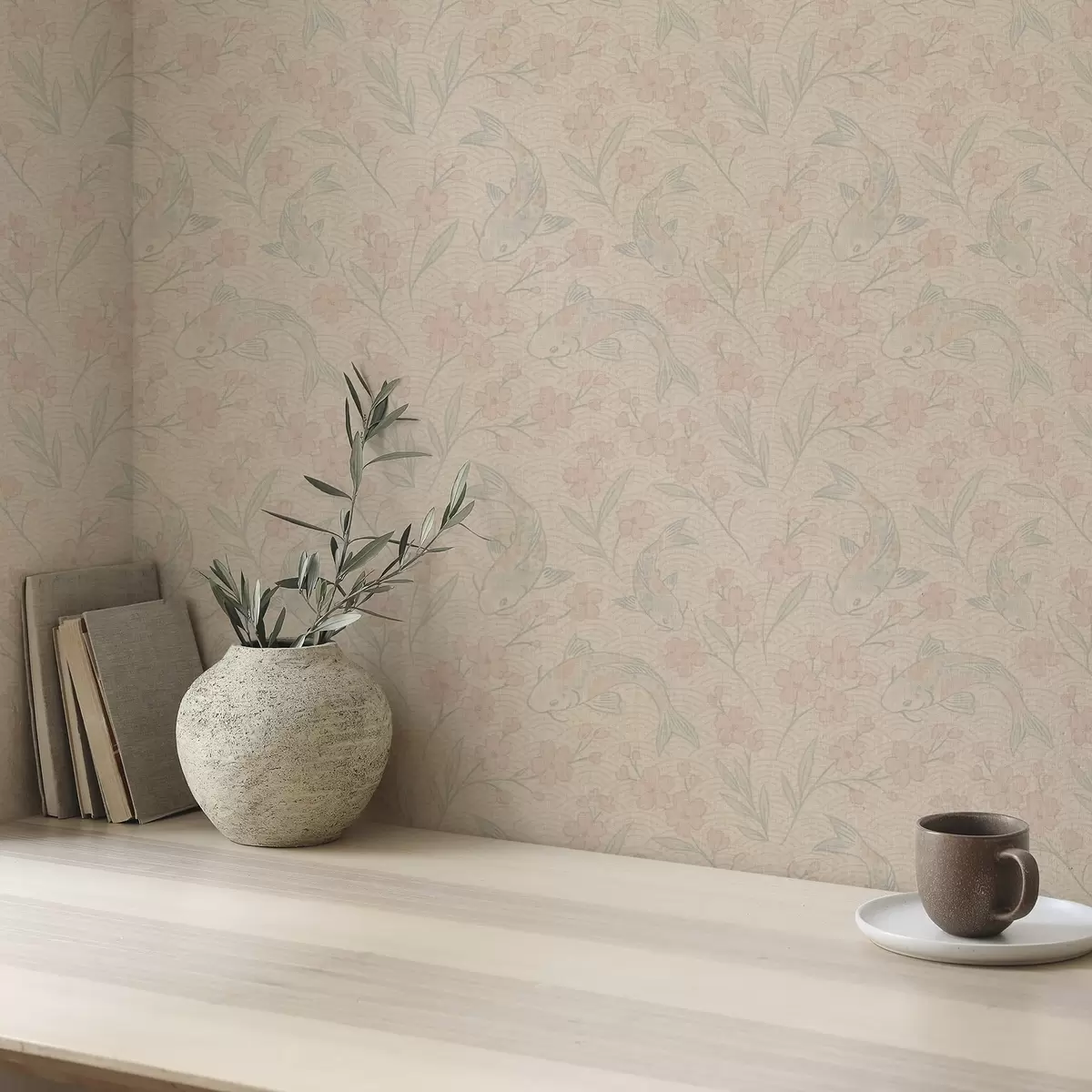 Papel tapiz Carpas entre flores en suaves tonos beige y rosa Nr. a00766