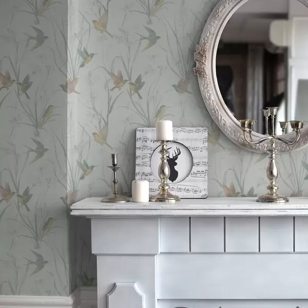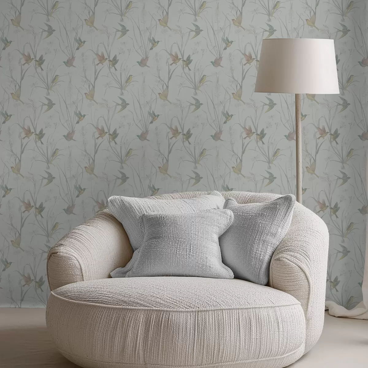 Papel tapiz Pájaros entre la hierba del prado sobre un fondo gris claro. Nr. a00776v1