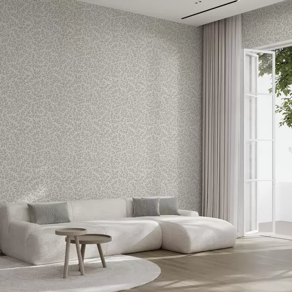 Papel pintado Ramitas con hojas y bayas, crema clara y salvia. a00783
