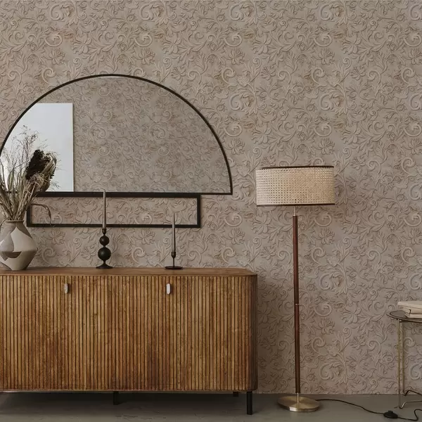 Papel tapiz Relieve en piedra con volutas florales, beige vintage Nr. a00784