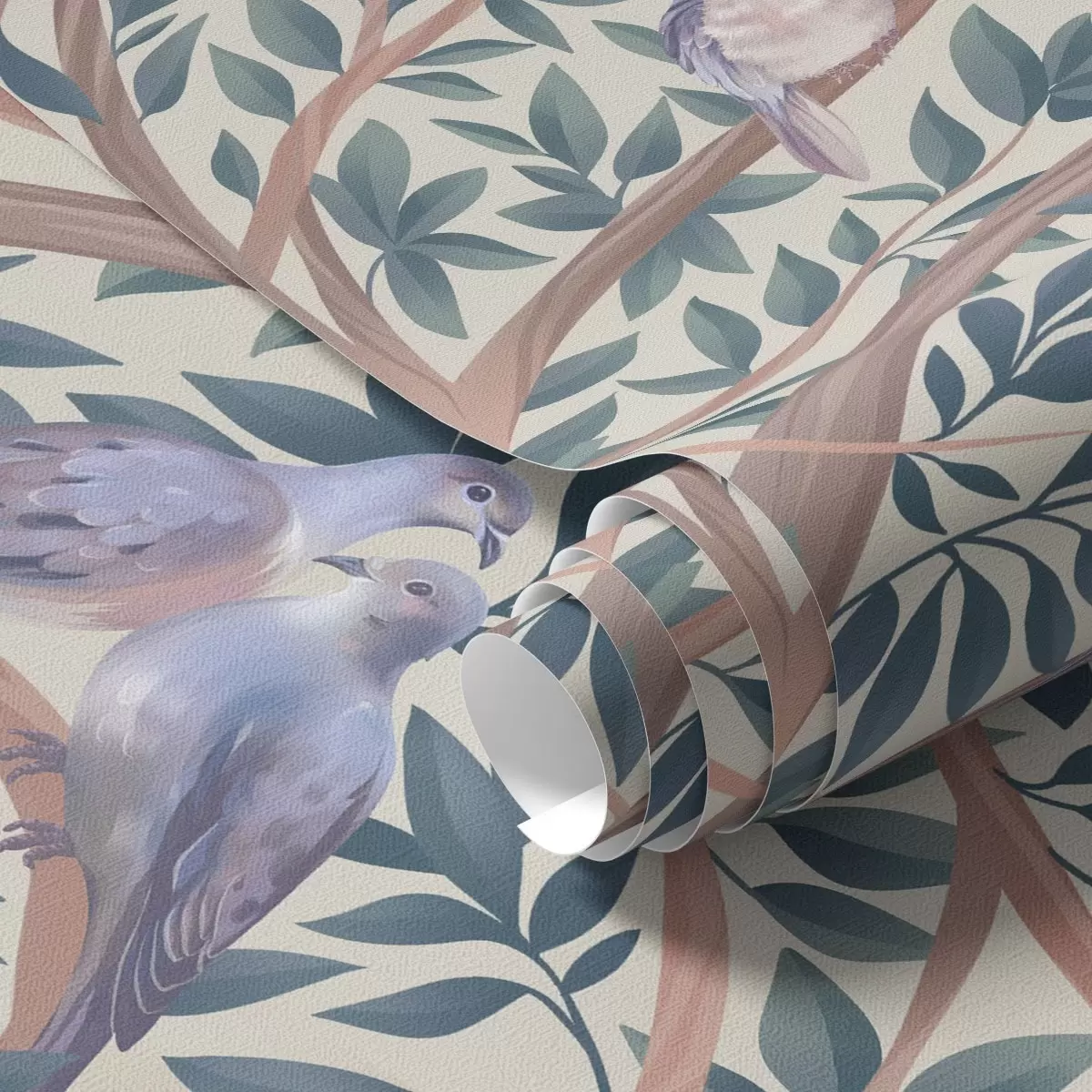 Papel tapiz Palomas entre ramas y hojas en una suave paleta de colores pastel Nr. a00796