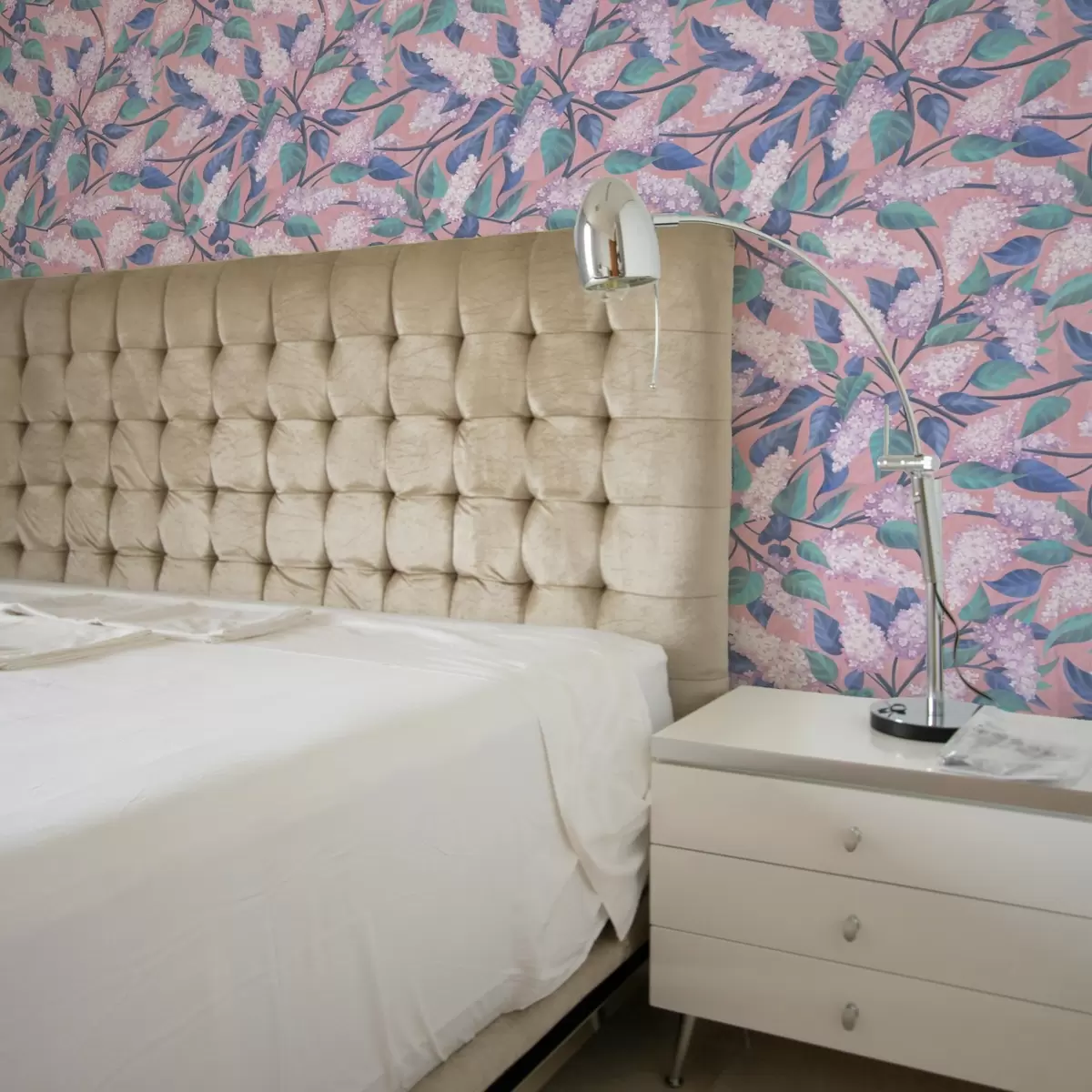 Papel tapiz Delicadas flores lilas sobre fondo rosa, ambiente primaveral Nr. a00797