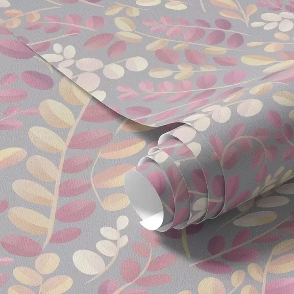 Papel tapiz Ramitas en tonos pastel con follaje rosa-melocotón sobre fondo gris Nr. a00799v1
