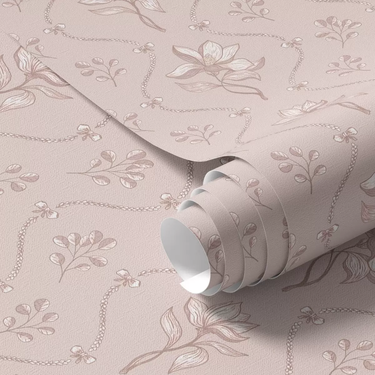 Papel pintado Pequeñas flores y cintas en suaves tonos rosa y beige a00808