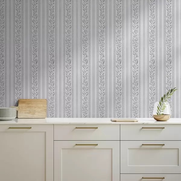Papel tapiz Rayas con encaje y ramitas en blanco frío Nr. a00814v1