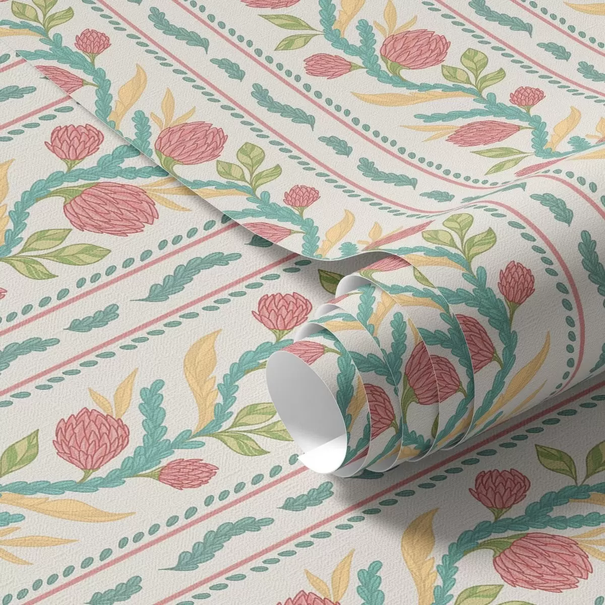 Papel tapiz Rayas con capullos de coral sobre fondo crema claro. Nr. a00816v1