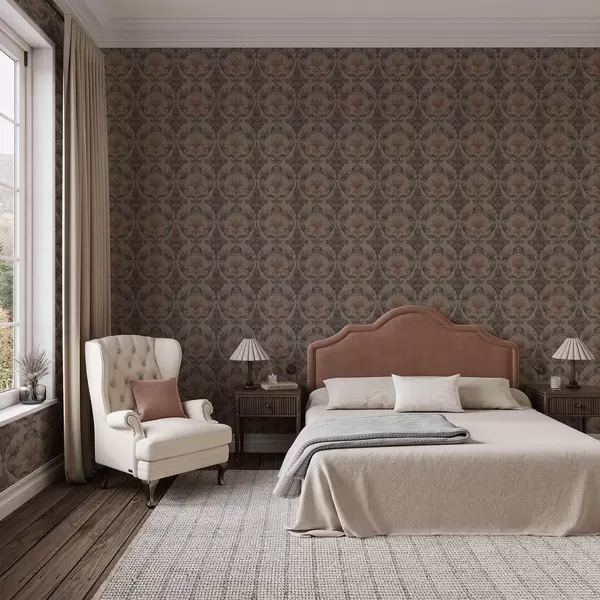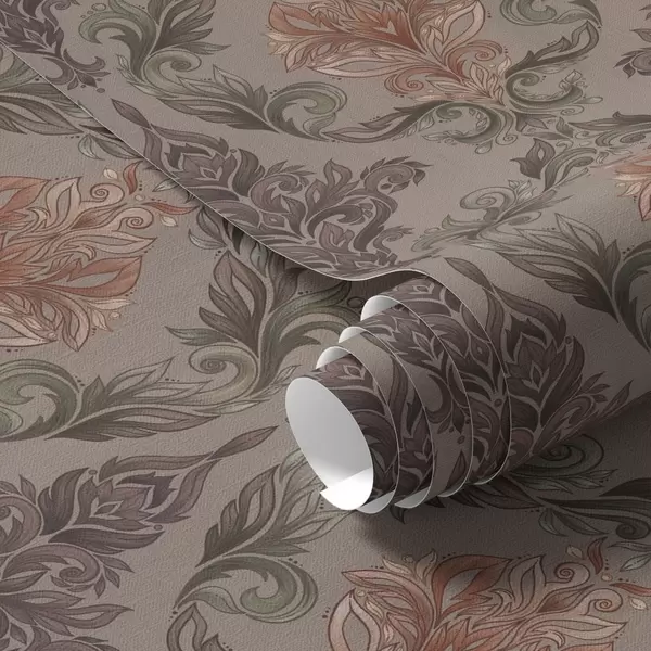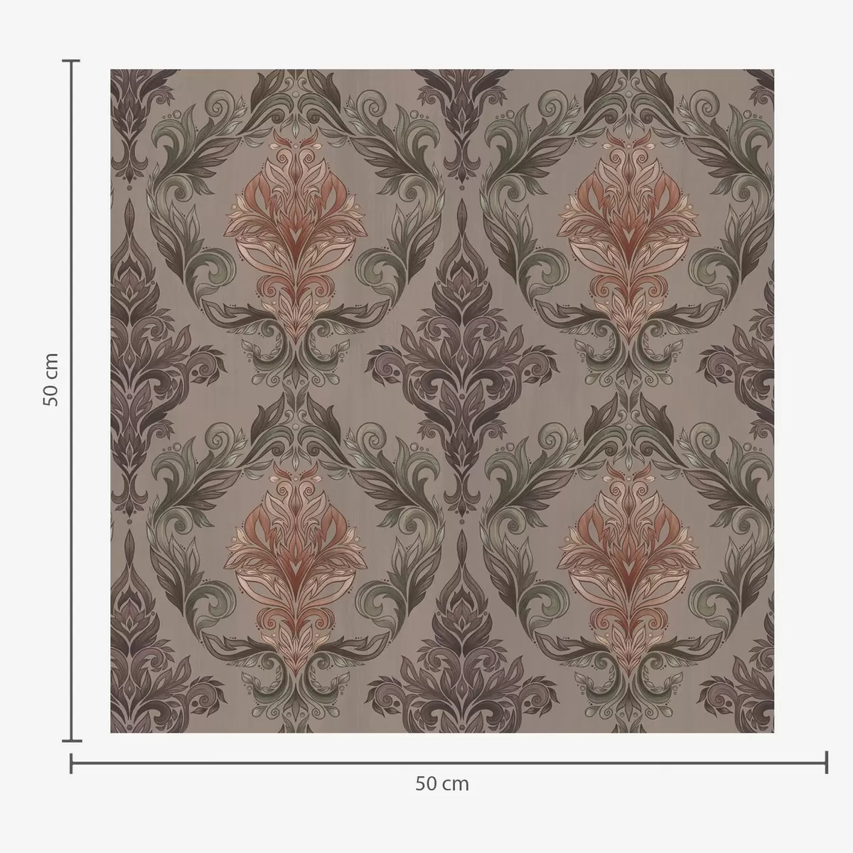 Papel tapiz Damasco en tonos marrón-terracota, fondo gris cálido. Nr. a00828v2