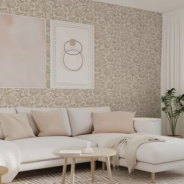 Papel tapiz Crisantemos y hojas de roble en suave marrón beige. Nr. a00840