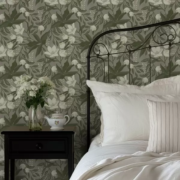 Papel tapiz Lirios pálidos y follaje sobre fondo gris oliva. Nr. a00854