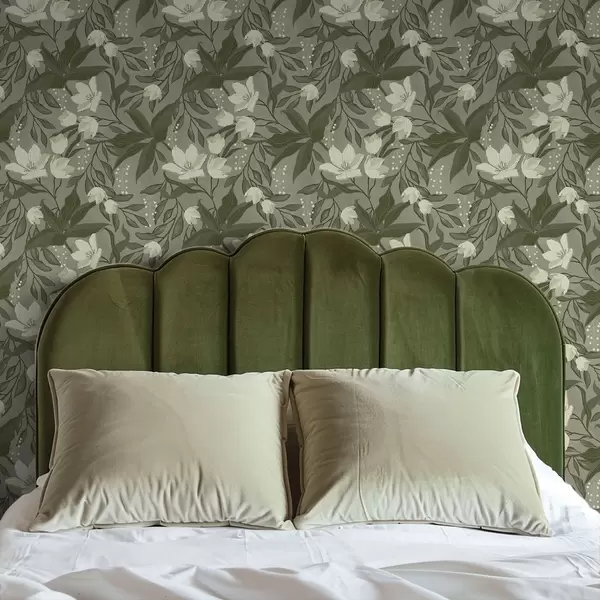 Papel tapiz Lirios pálidos y follaje sobre fondo gris oliva. Nr. a00854