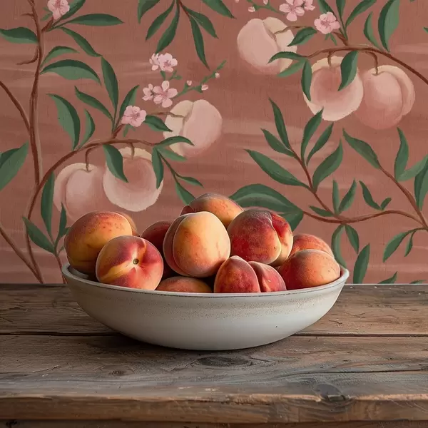 Papel tapiz Melocotones en ramas con flores rosas, suelo de terracota Nr. a00856