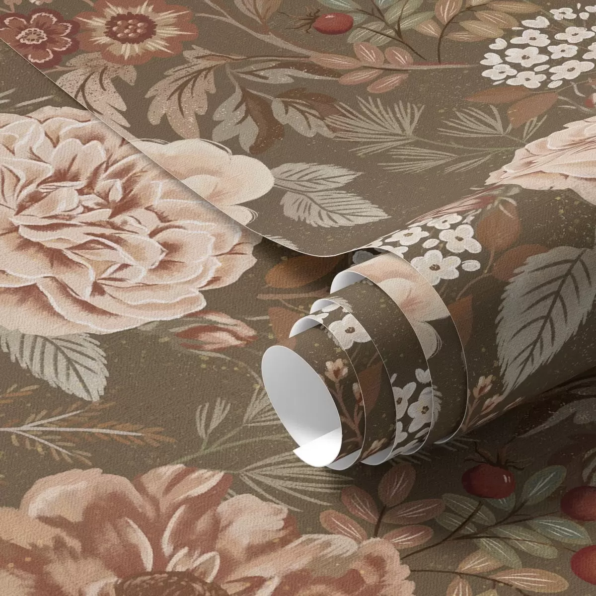 Papel tapiz Rosas cálidas y bayas sobre fondo marrón Nr. a00868