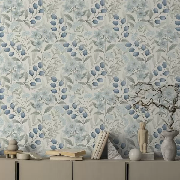 Papel tapiz Arándanos azules y flores claras sobre marfil Nr. a00872