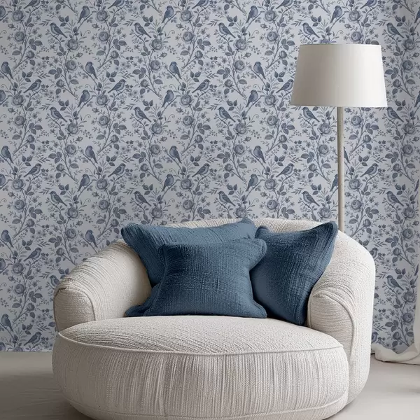 Papel tapiz Pájaros y rosas azules sobre fondo blanco Nr. a00873