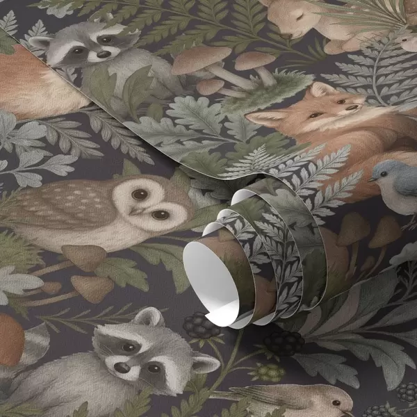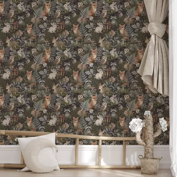 Papel tapiz Animales del bosque y helechos sobre carbón oscuro Nr. a00880