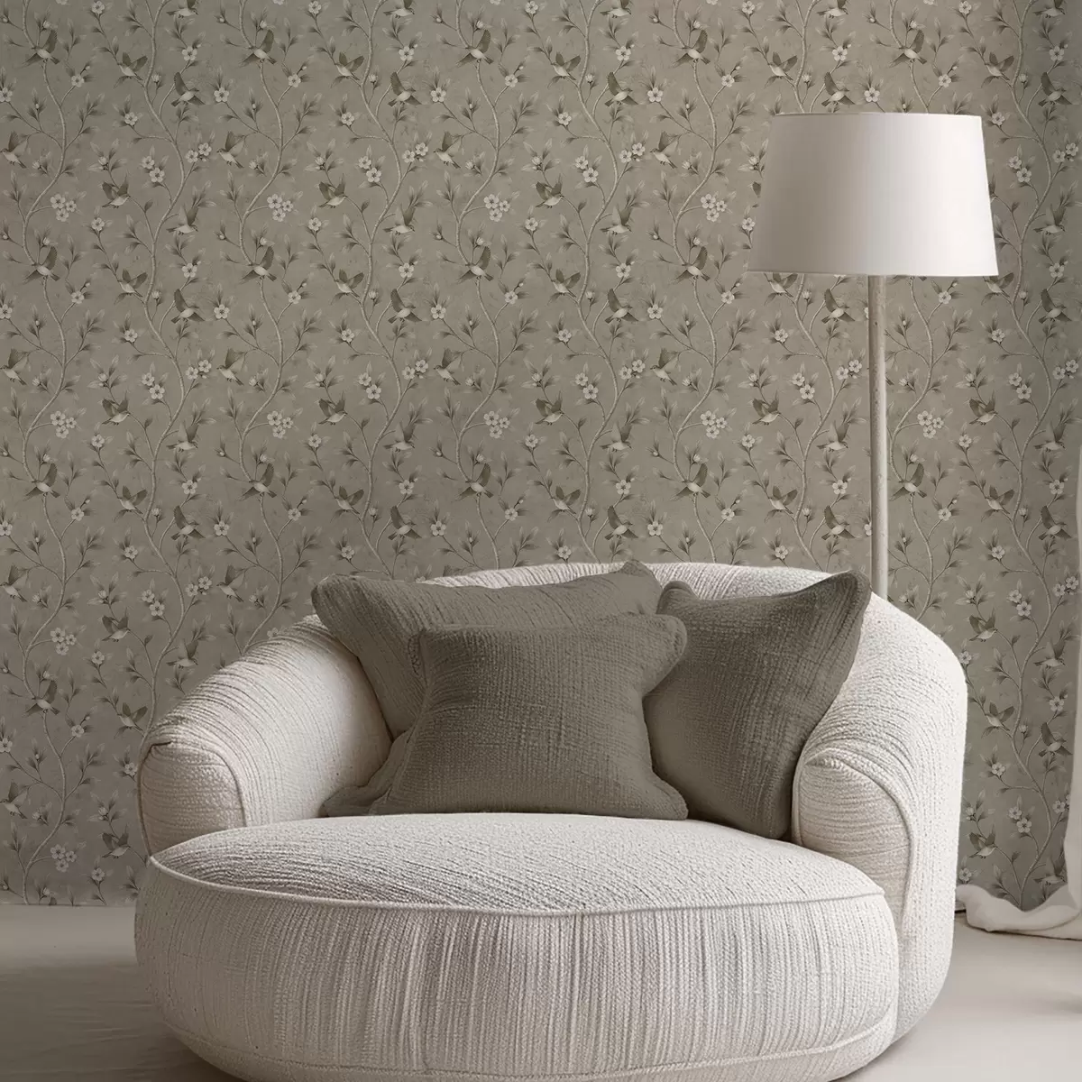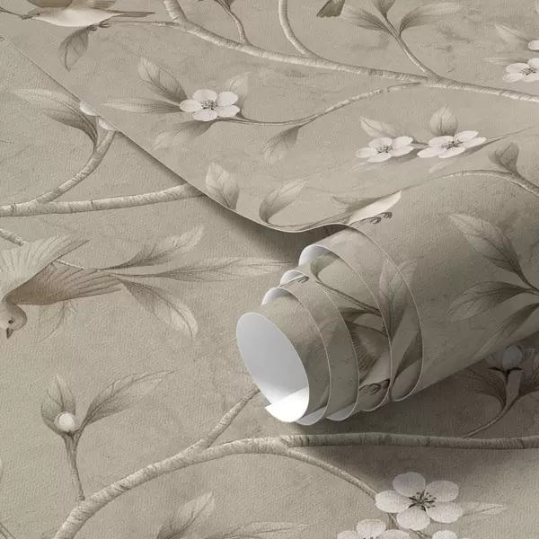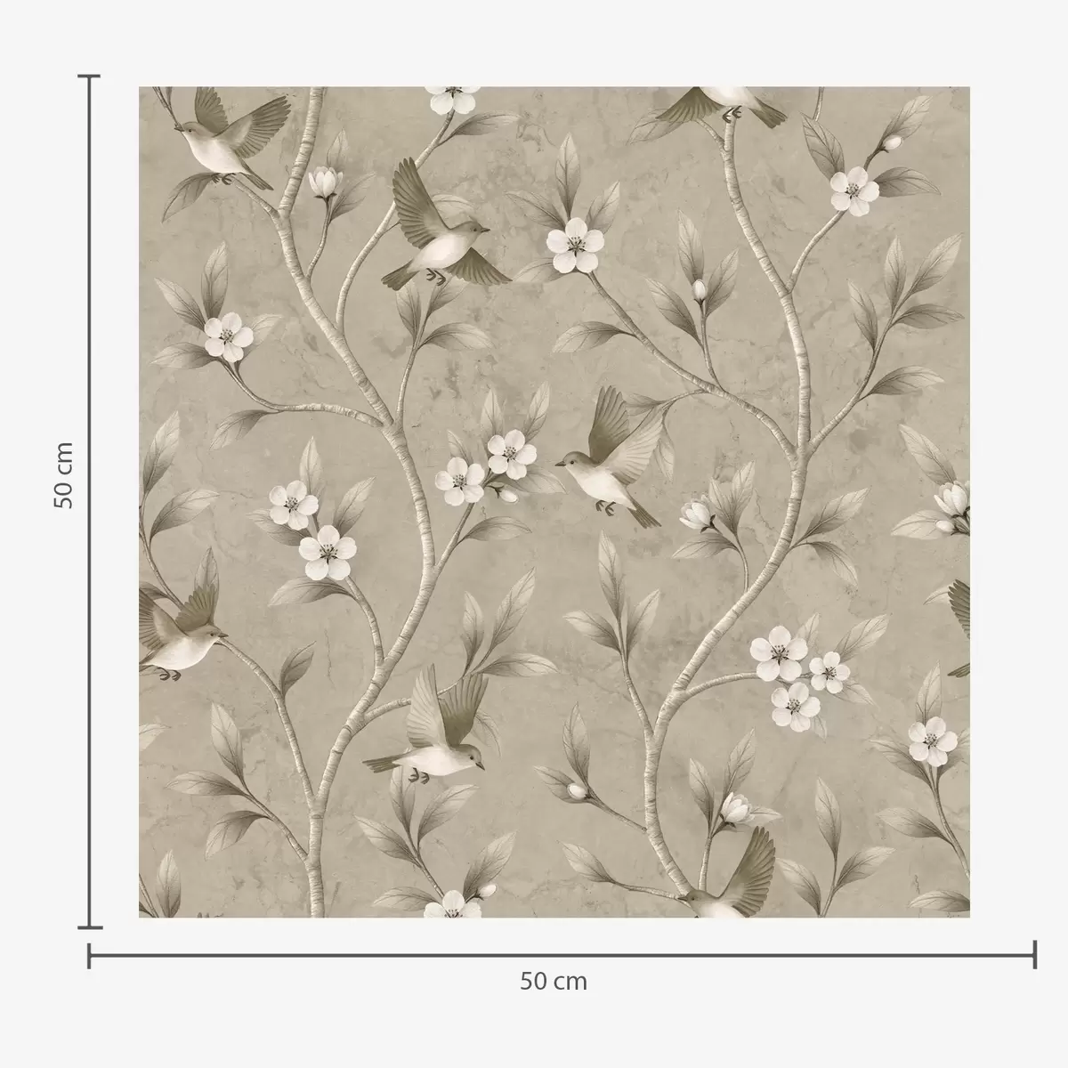 Papel tapiz Pájaros y ramas en flor en cálidos tonos sepia. Nr. a00882
