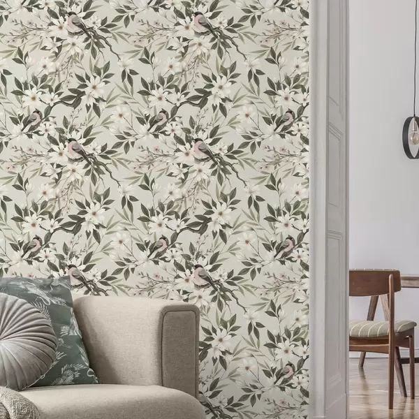 Papel tapiz Pintassilgos con el pecho blanco posados en ramas con flores color crema Nr. a00889