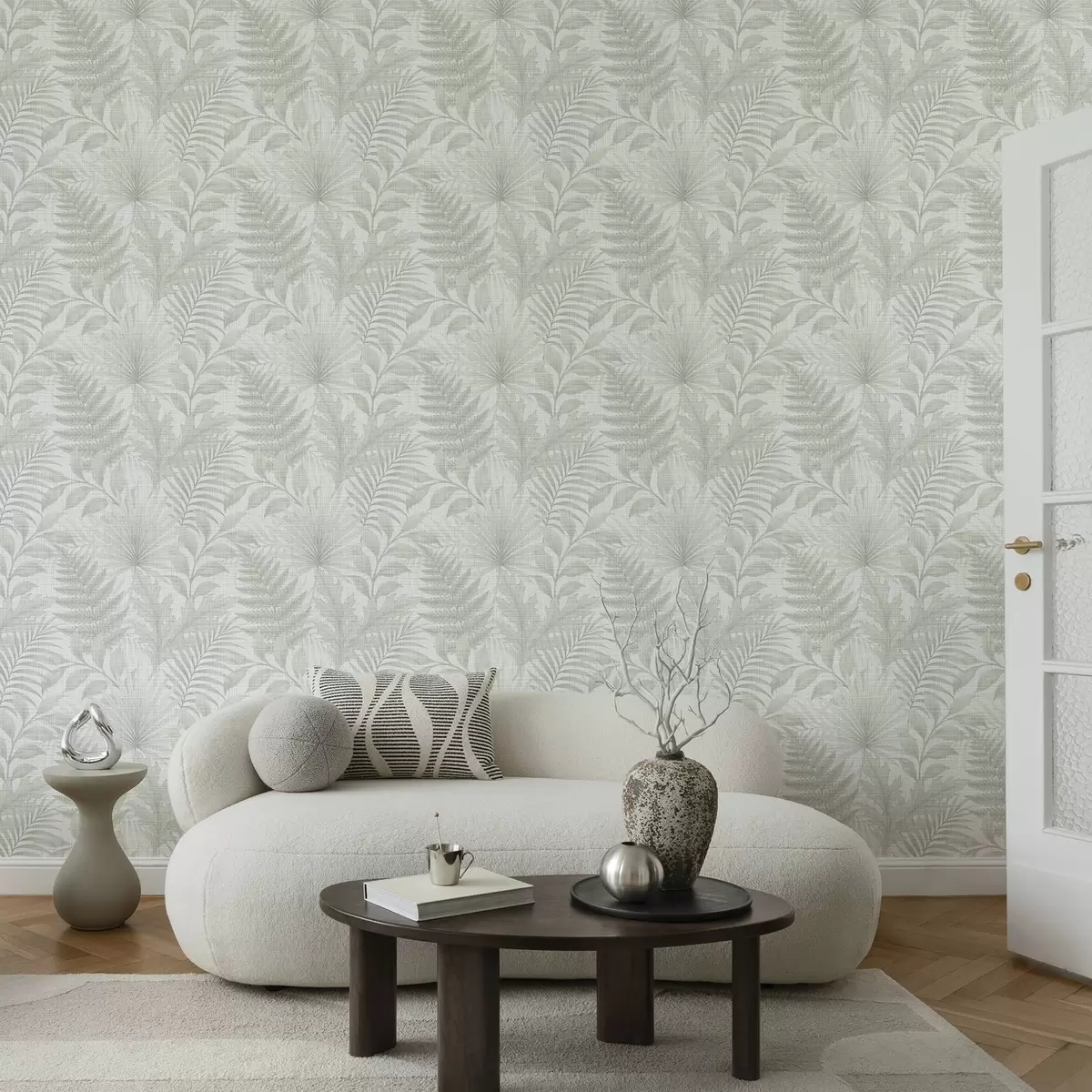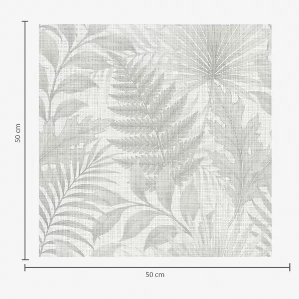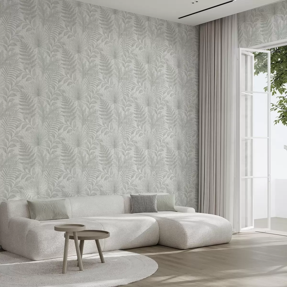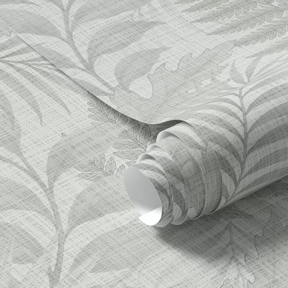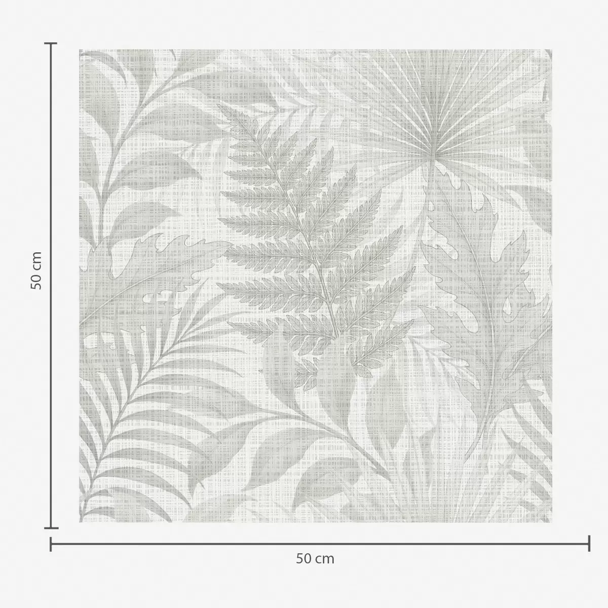 Papel tapiz Hojas tropicales suaves en gris pálido sobre textura de lino. Nr. a00899