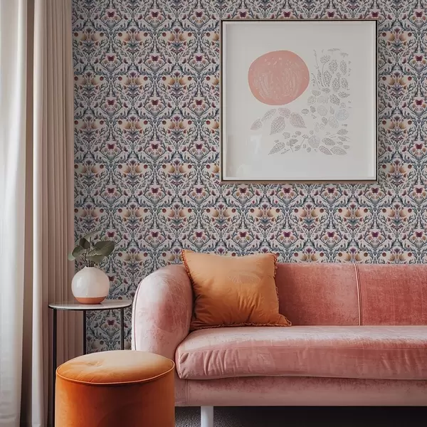 Papel tapiz Damasco floral con mariposas sobre fondo melocotón suave. Nr. a00926