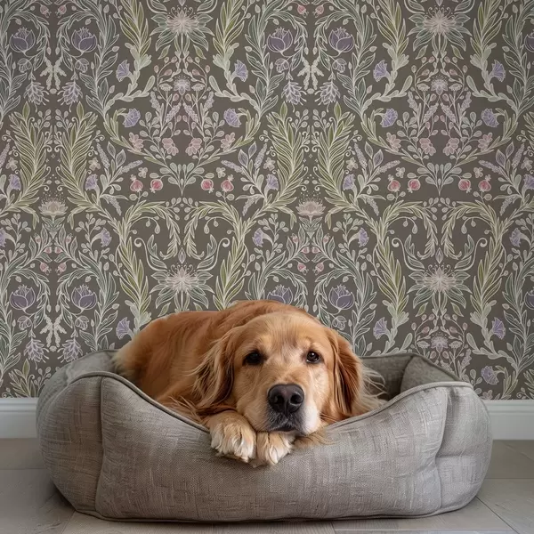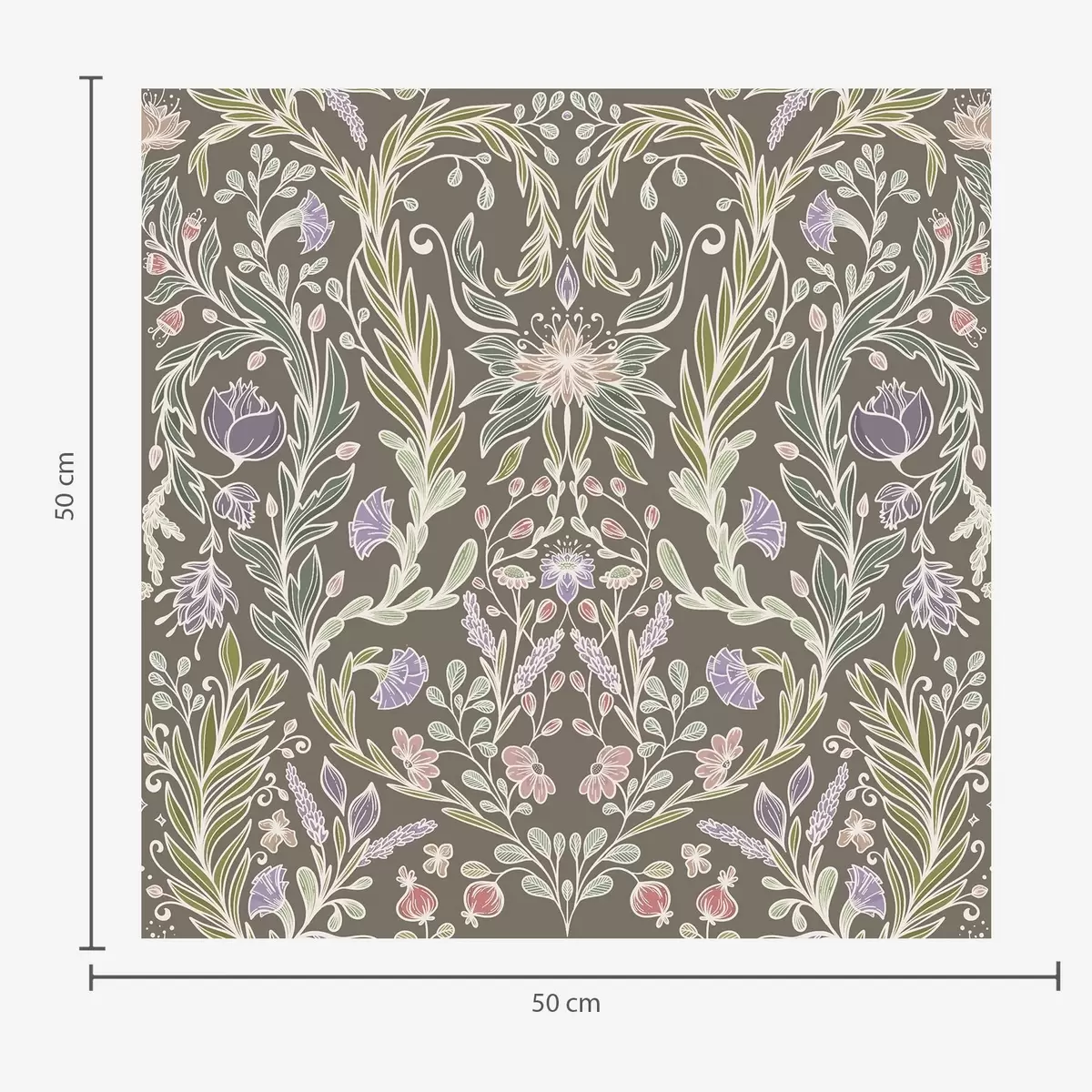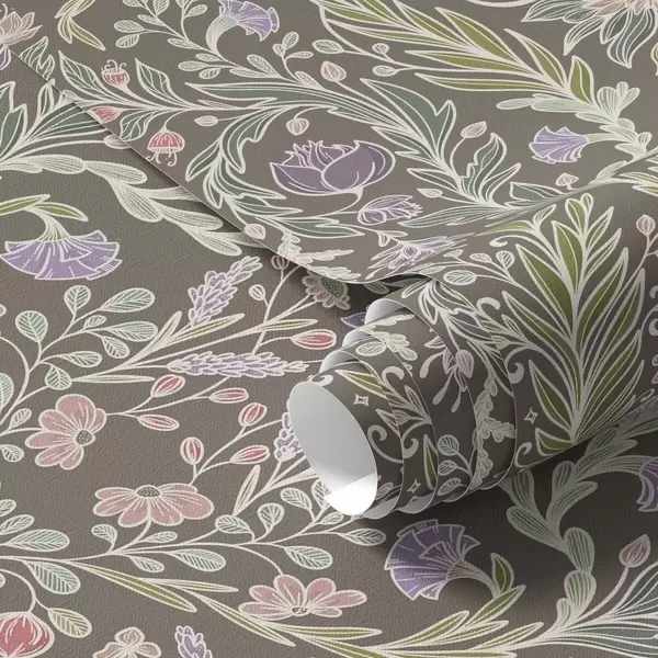 Papel tapiz Flores y hojas simétricas sobre un fondo gris marrón. Nr. a00928v2