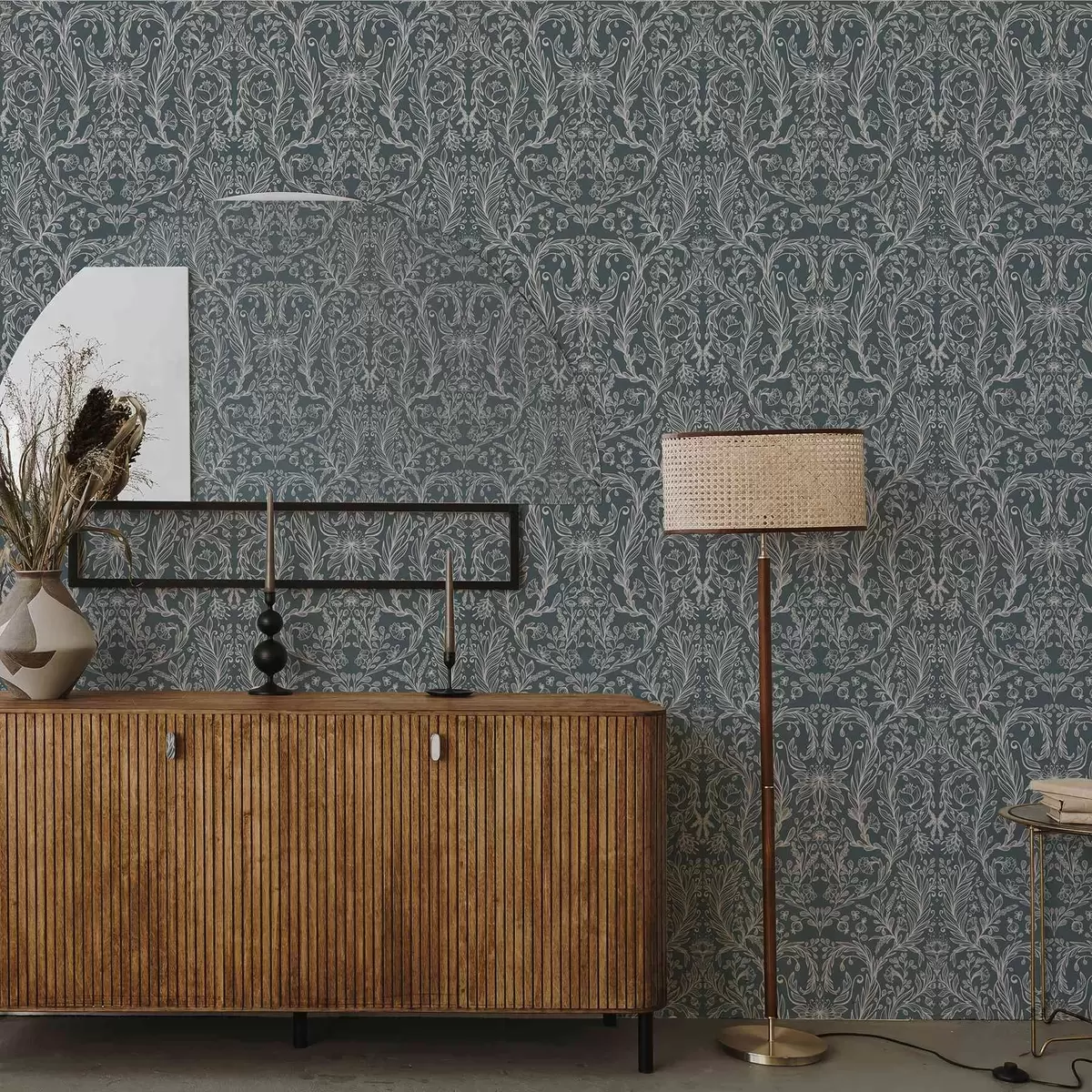 Papel tapiz Adorno floral lineal sobre fondo gris azulado. Nr. a00929v1