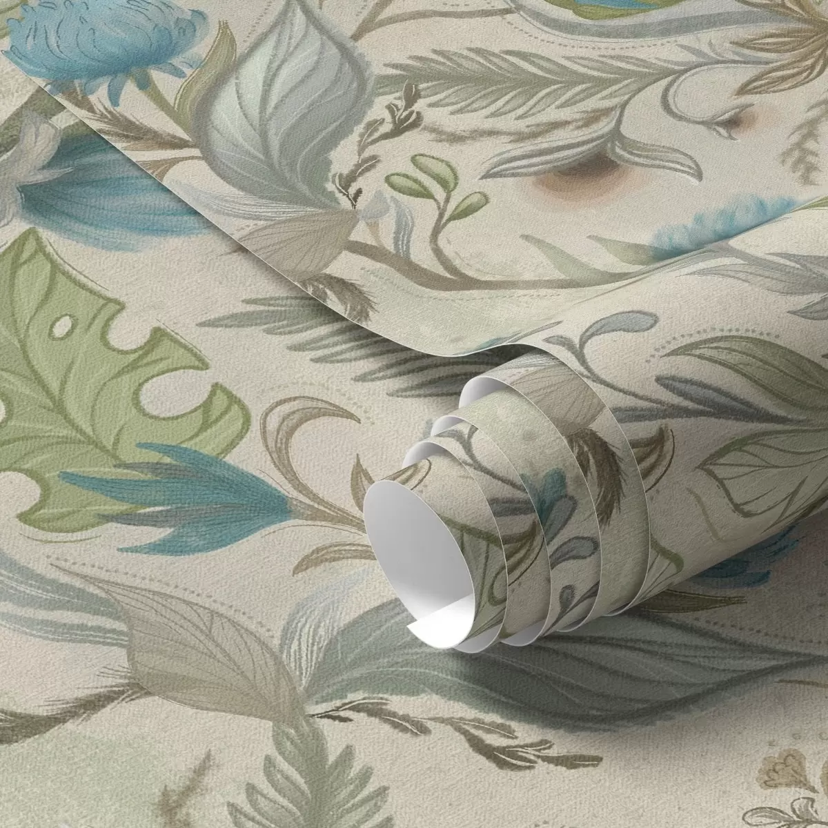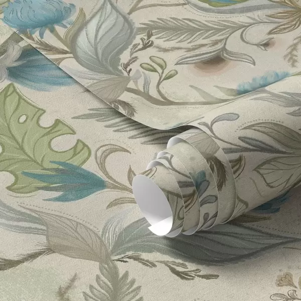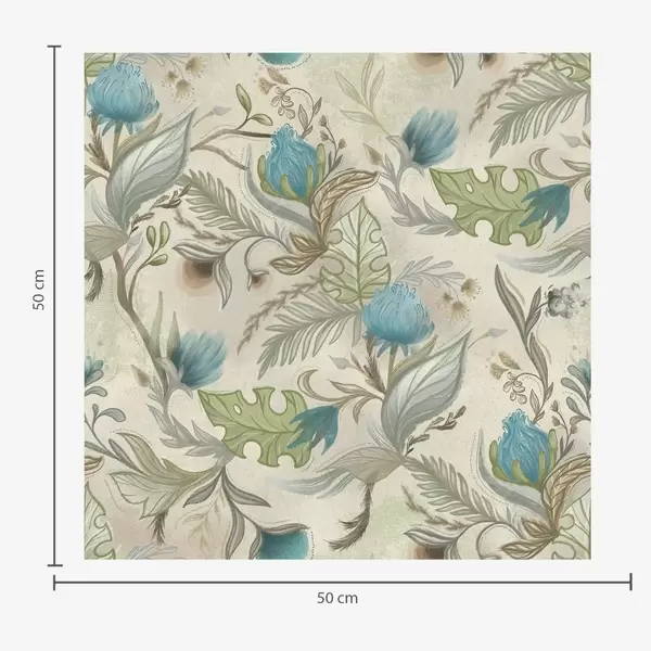 Papel tapiz Capullos y hojas azules sobre un fondo beige claro. Nr. a00930
