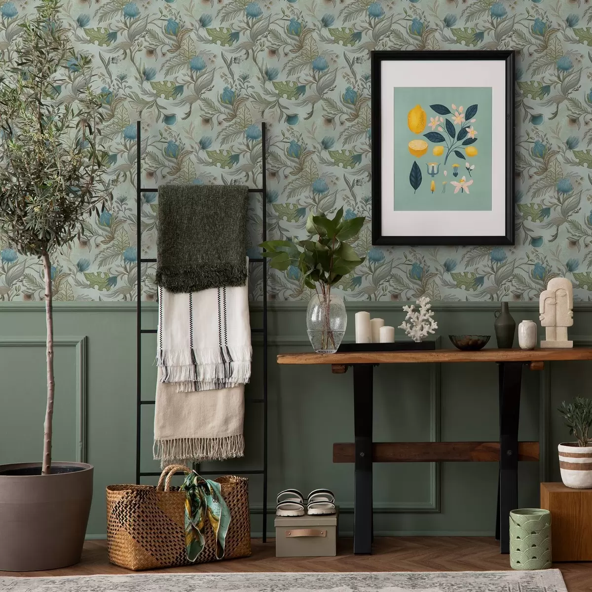 Papel tapiz Flores azules y vegetación sobre un suave fondo menta. Nr. a00930v1
