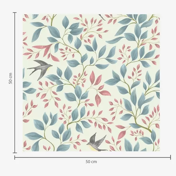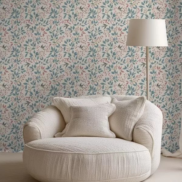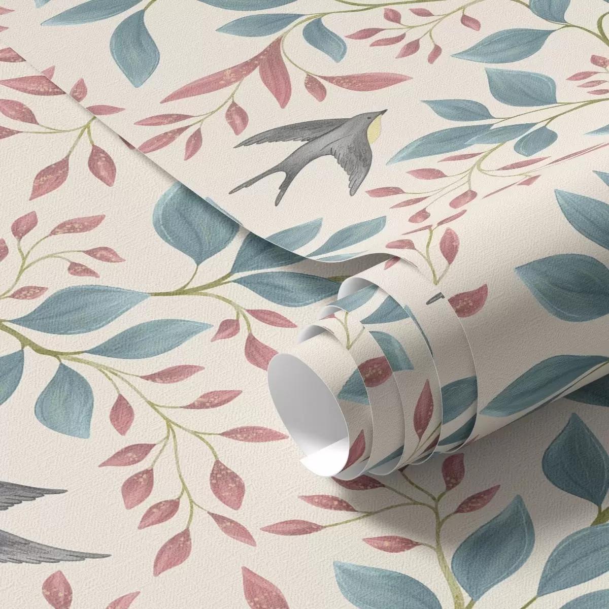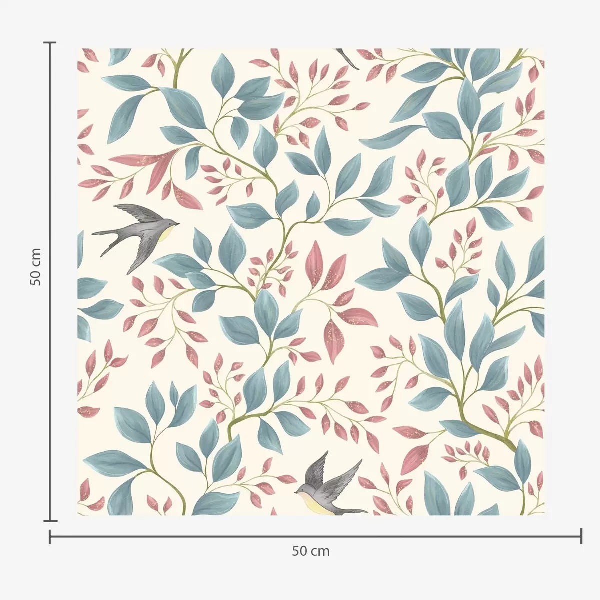Papel tapiz Ramitas azules y rosas con pájaros sobre fondo crema. Nr. a00933