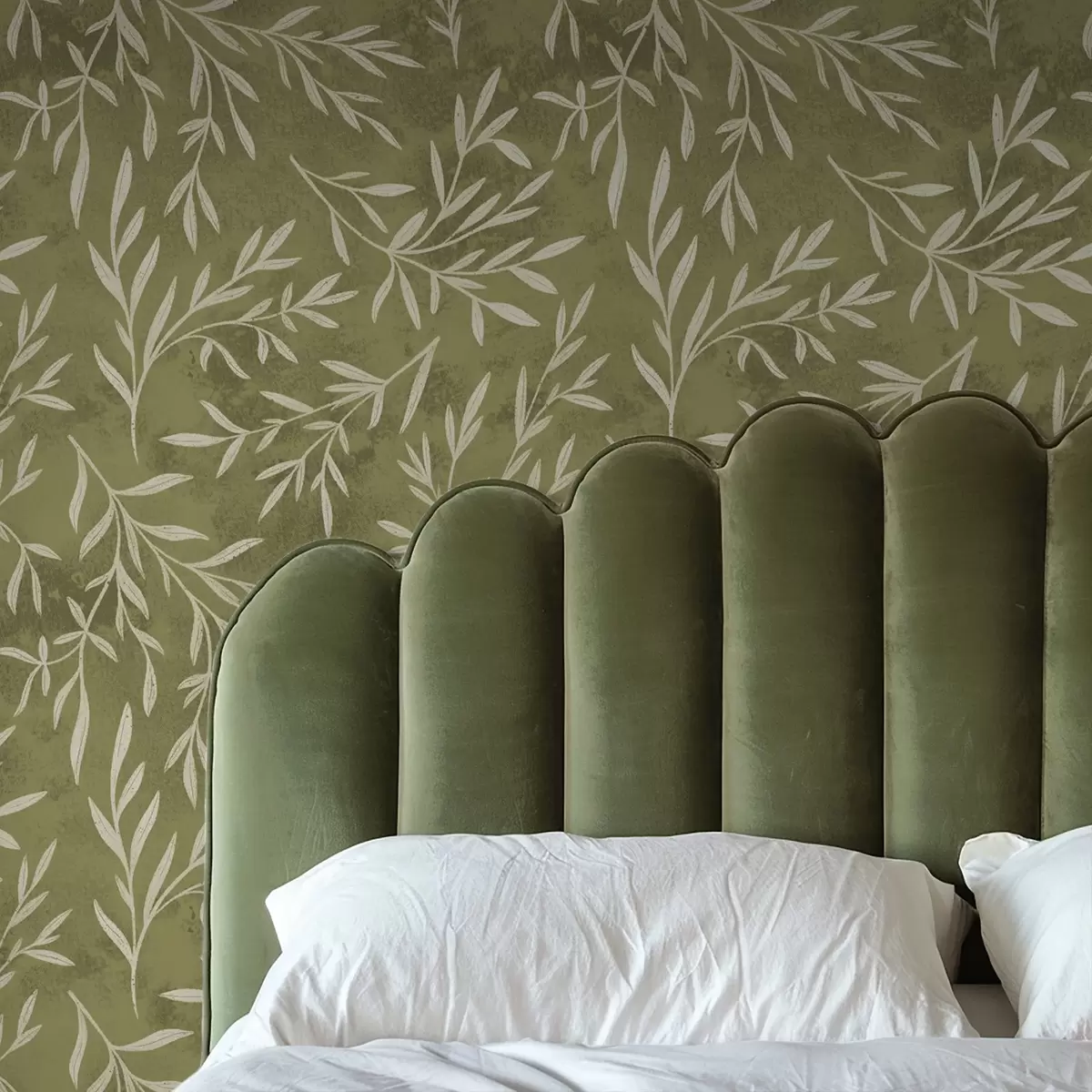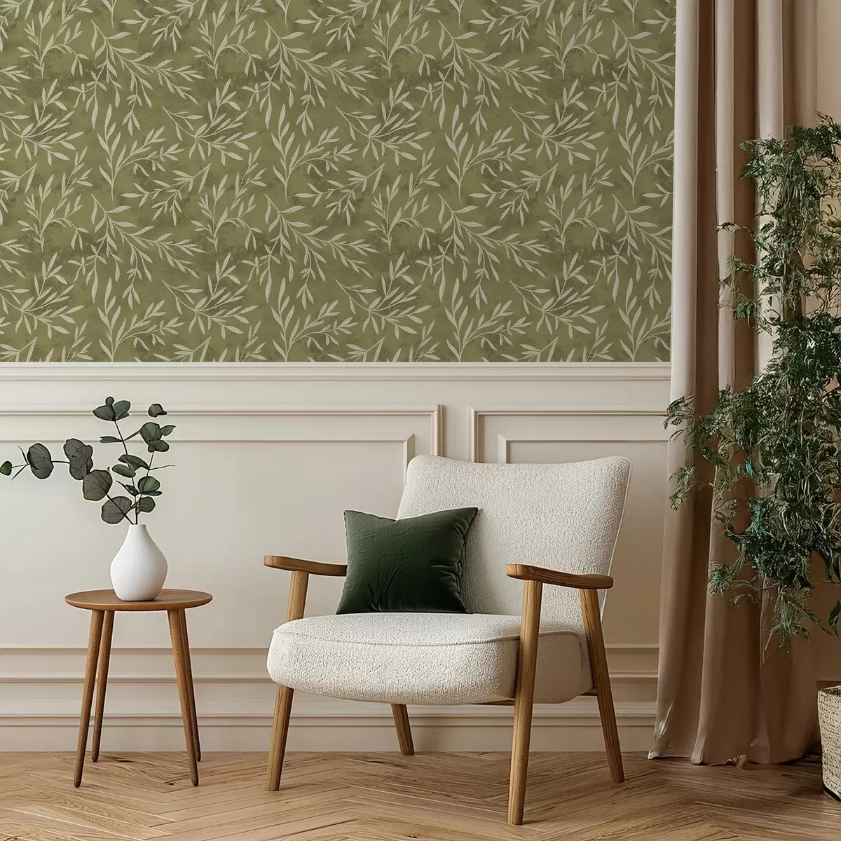 Papel tapiz Ramitas de color blanco crema sobre un fondo cálido con textura oliva. Nr. a00936v1