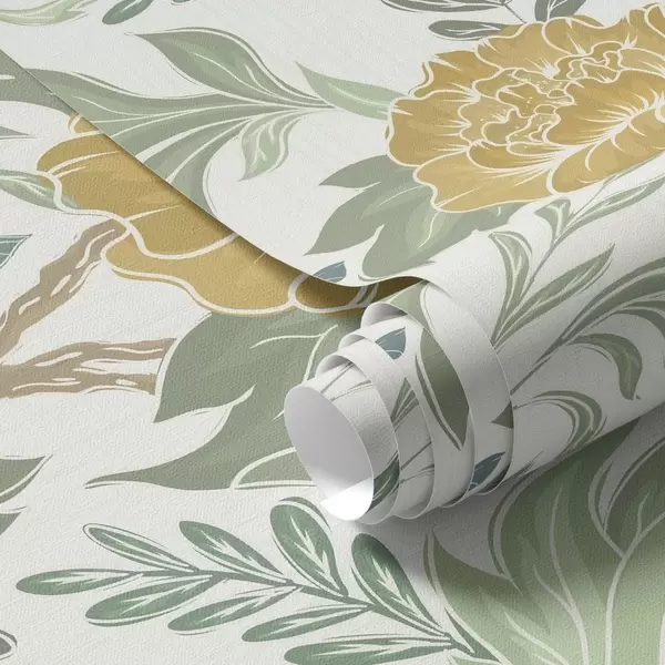 Papel tapiz Grandes peonías amarillas y vegetación sobre un fondo claro. Nr. a00941