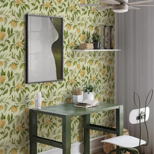 Papel tapiz Peonías amarillas y follaje sobre un fondo verde claro suave Nr. a00942