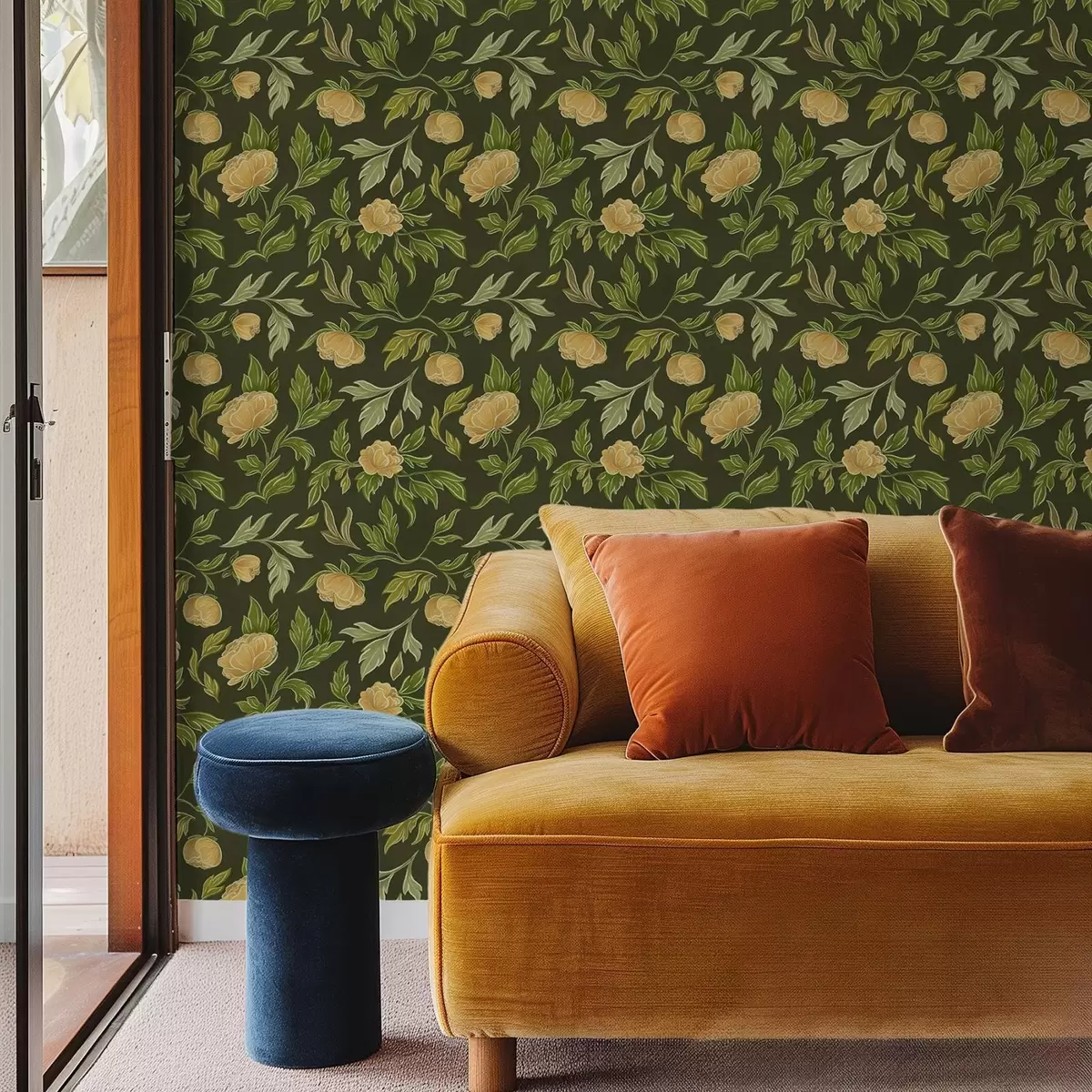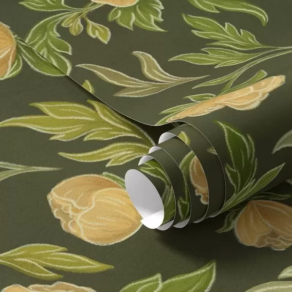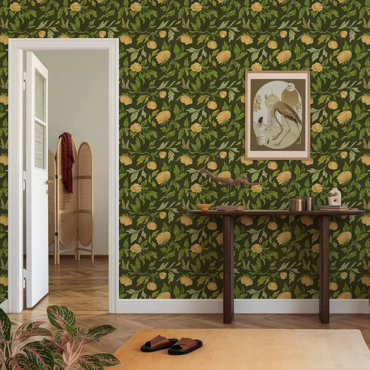 Papel tapiz Peonías amarillas sobre un fondo verde oscuro intenso. Nr. a00942v1