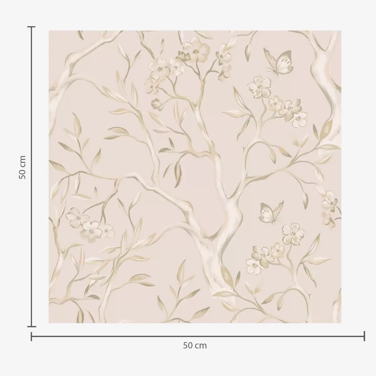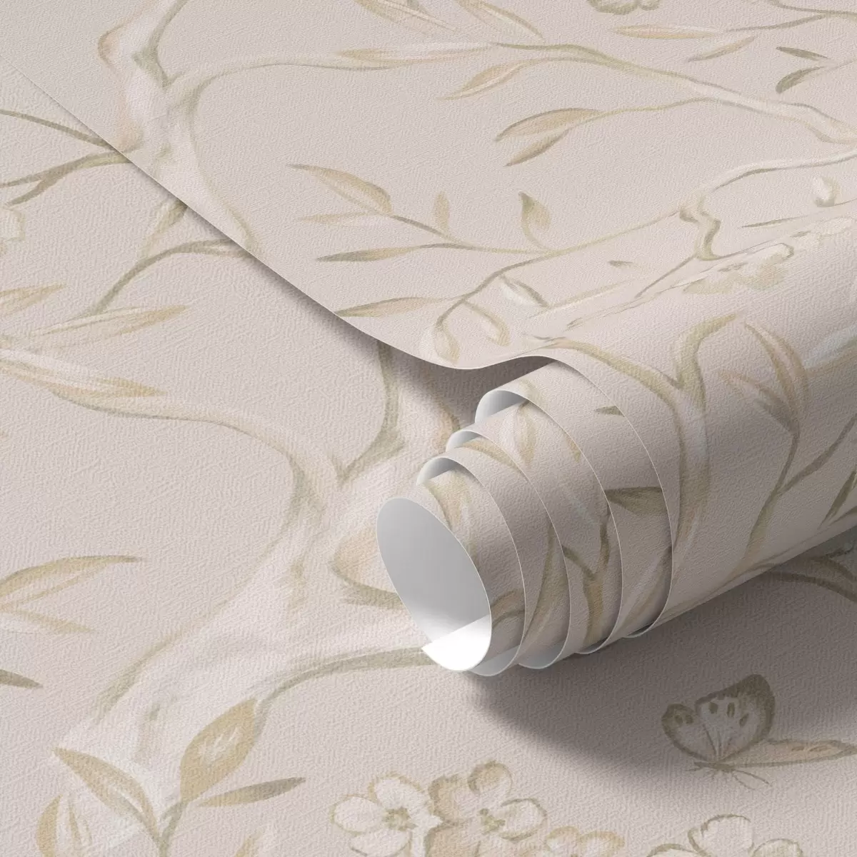 Papel tapiz Ramas con flores de color beige y mariposas sobre un fondo suave. Nr. a00951v2
