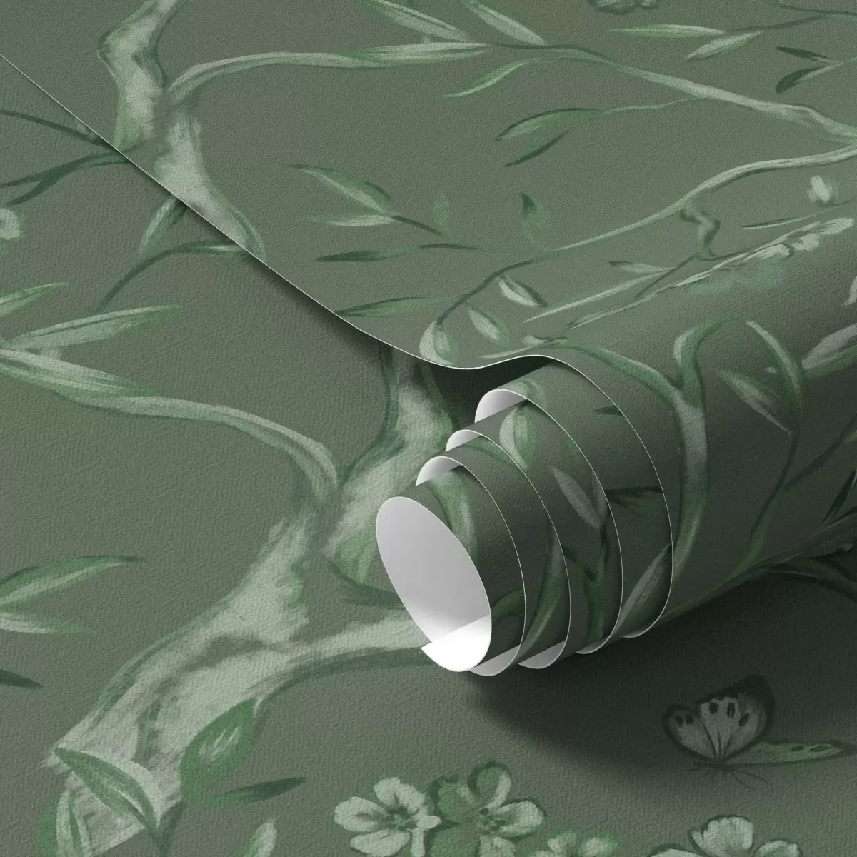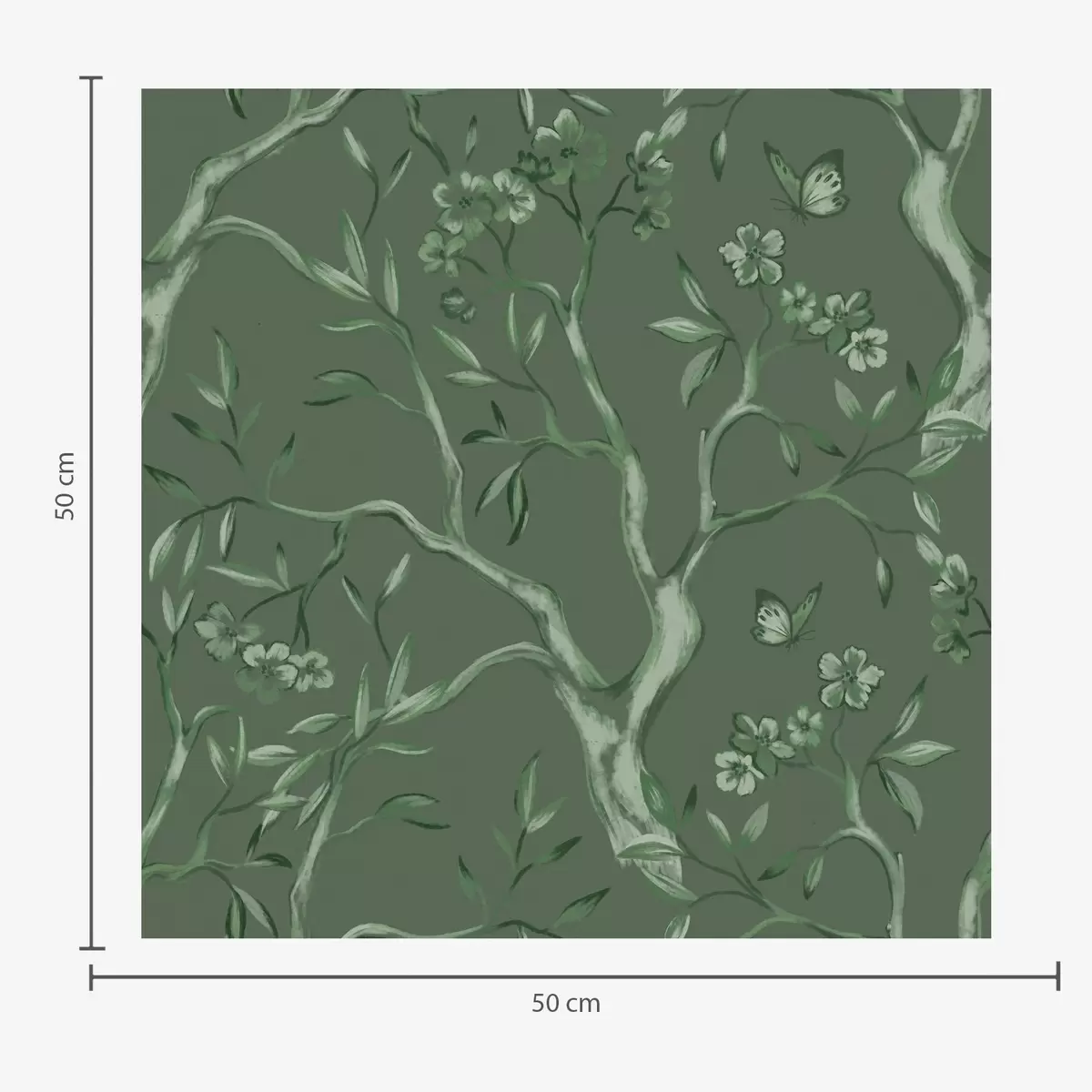 Papel tapiz Ramas con flores verdes y mariposas sobre un fondo oscuro. Nr. a00951v3