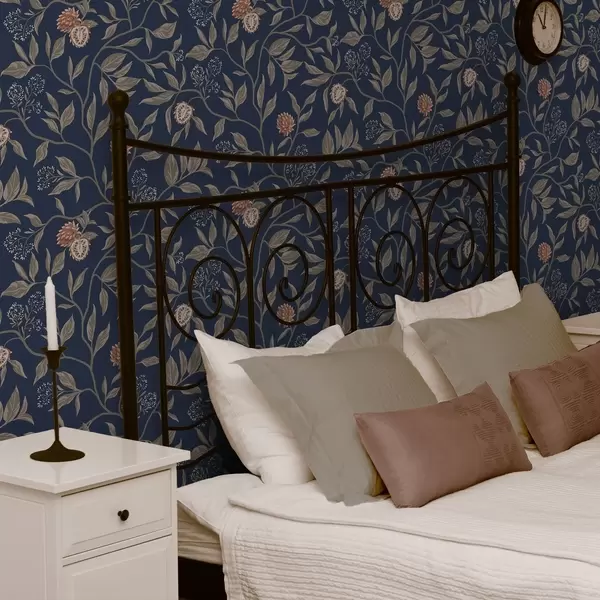 Papel tapiz Jardín azul con ramas, frutos y pequeñas flores Nr. a00959