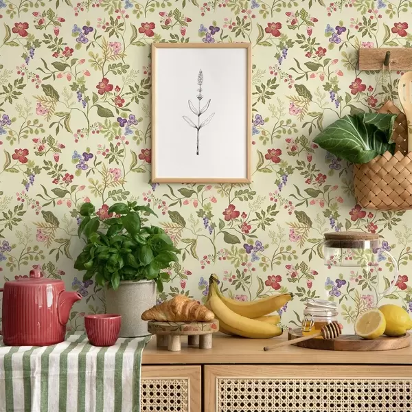 Papel tapiz Jardín floreciente con bayas, uvas y flores silvestres Nr. a00961