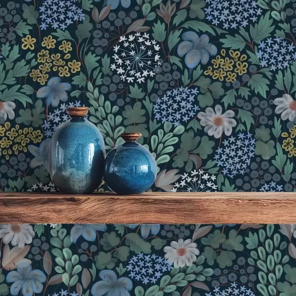 Papel tapiz Jardín nocturno con lirios azules, bayas y vegetación silvestre Nr. a00996