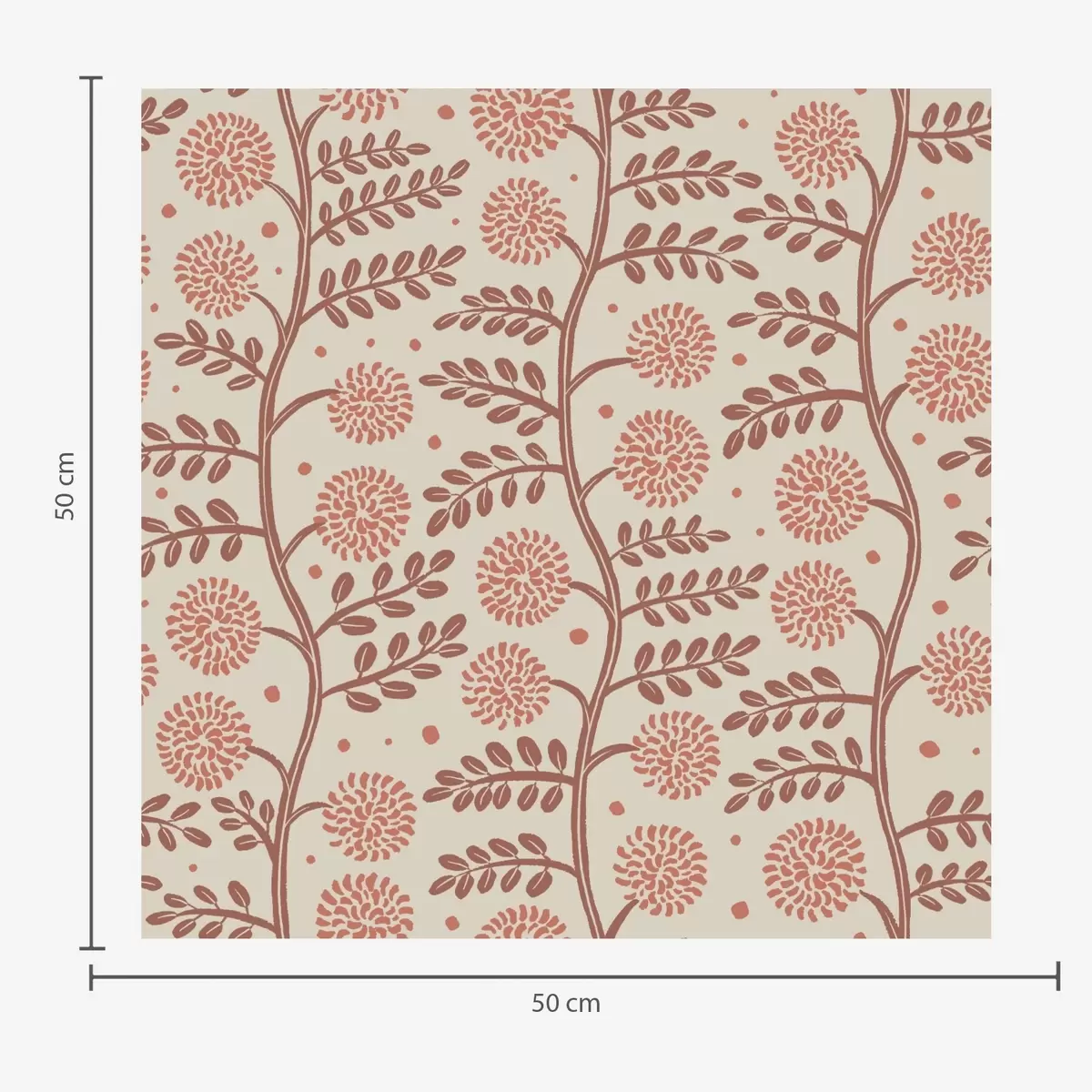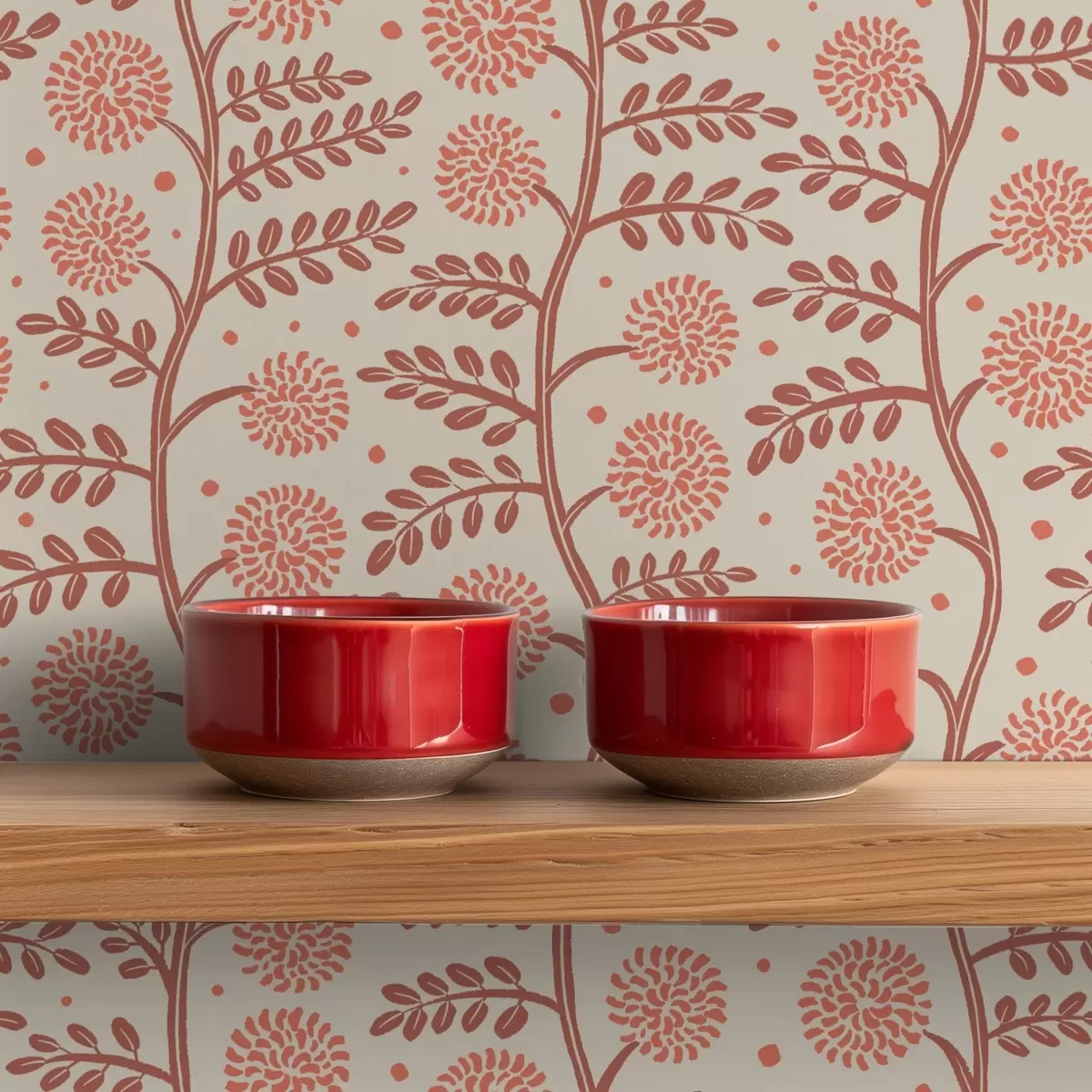 Papel tapiz Tallos de terracota con flores coralinas y esponjosas sobre fondo crema. Nr. a00997v1