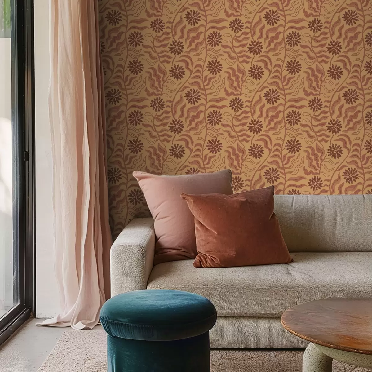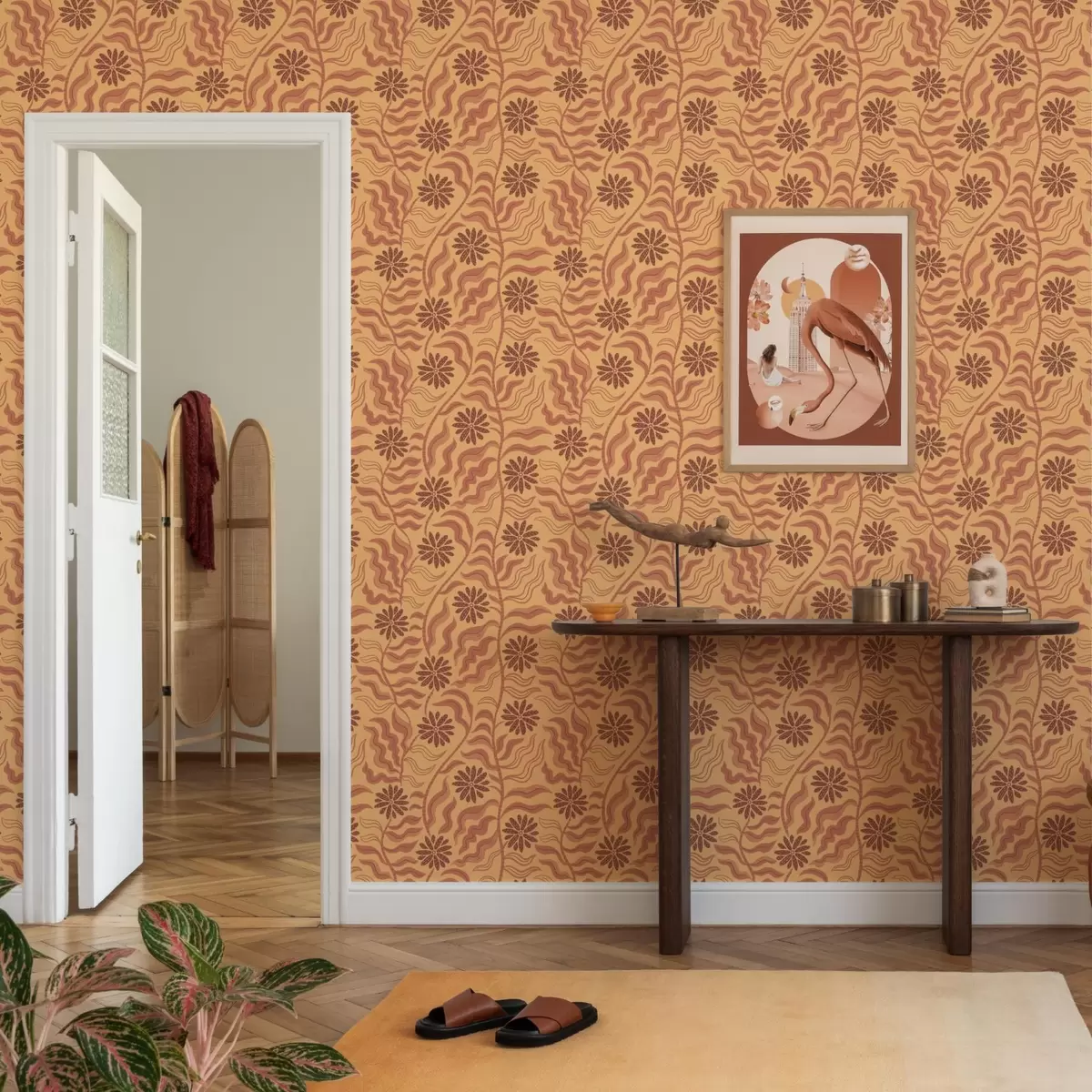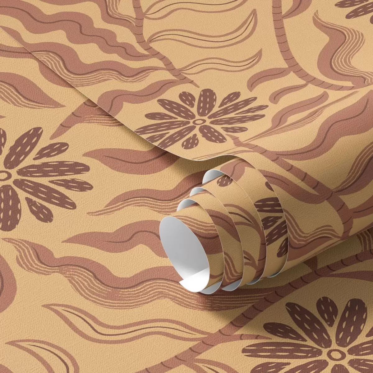 Papel tapiz Flores y hojas onduladas cálidas en tonos mostaza y terracota Nr. a00998v2