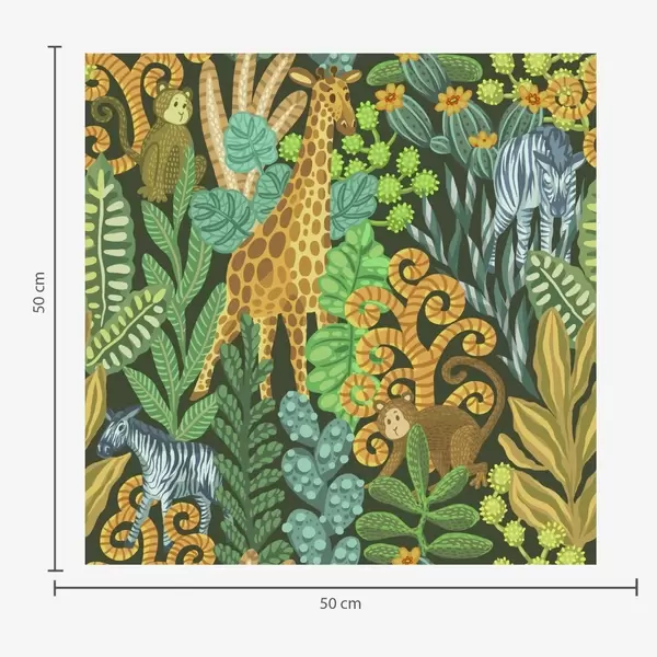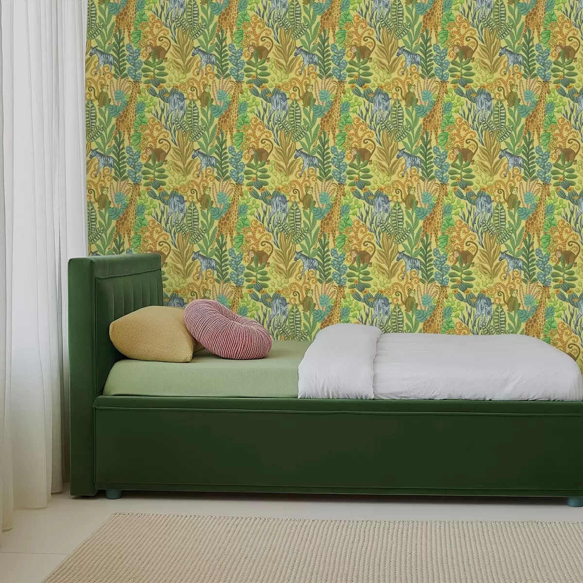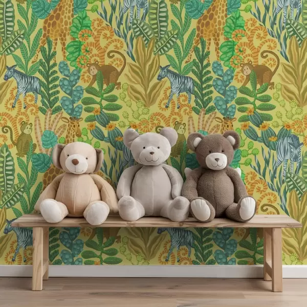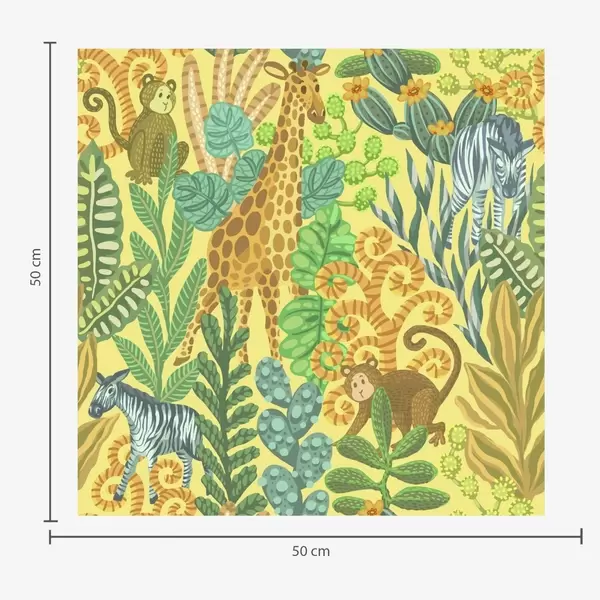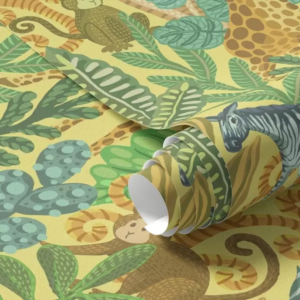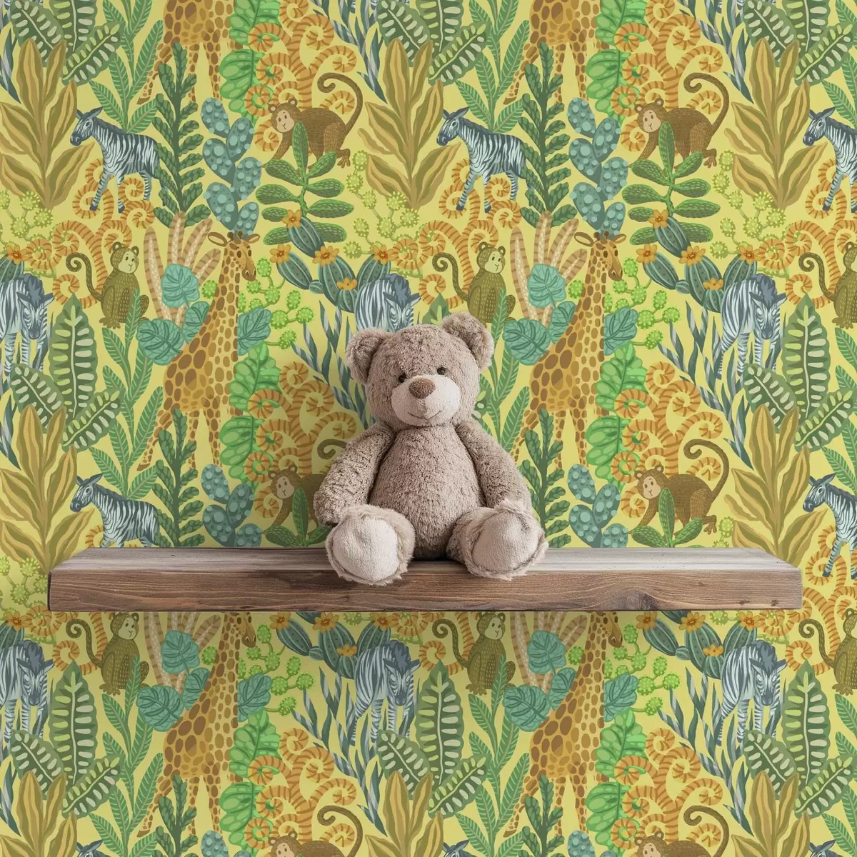 Papel tapiz Jirafa, cebra y mono en una sabana de color amarillo brillante. Nr. a01000v1