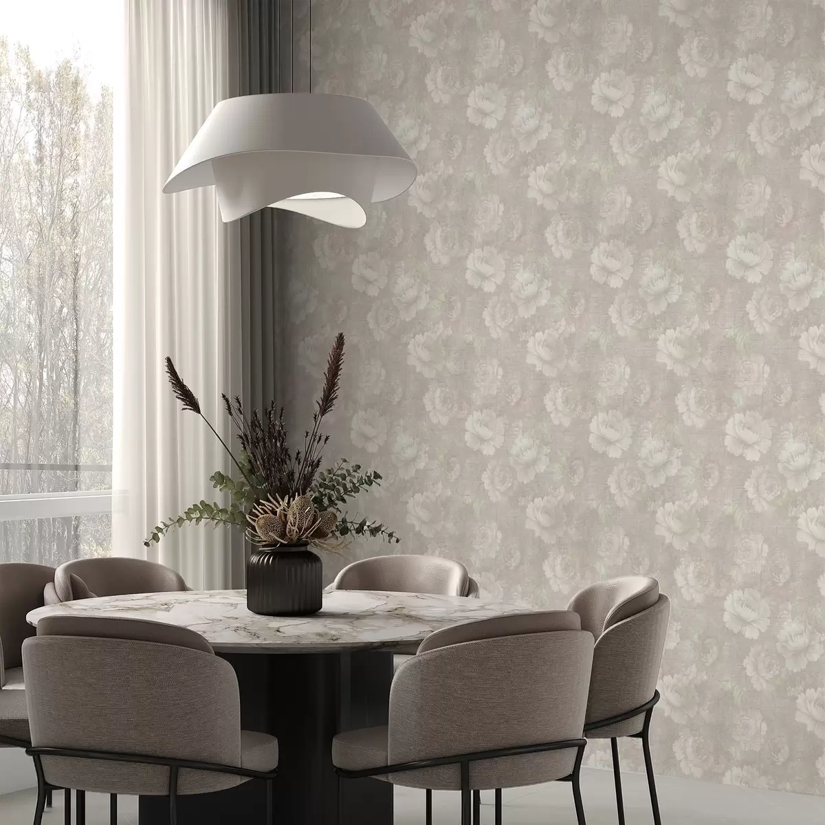 Papel tapiz Peonías descoloridas sobre textura de lino en una suave paleta de colores beige Nr. a01018