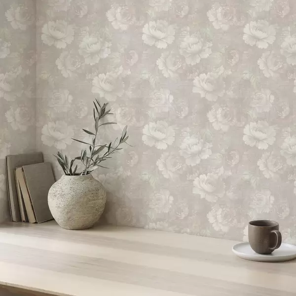 Papel tapiz Peonías descoloridas sobre textura de lino en una suave paleta de colores beige Nr. a01018