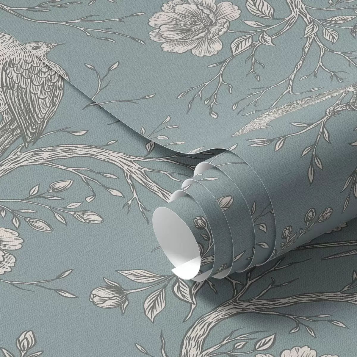 Papel tapiz Pájaros dibujados en contorno sobre ramas, fondo azul apagado. Nr. a01022