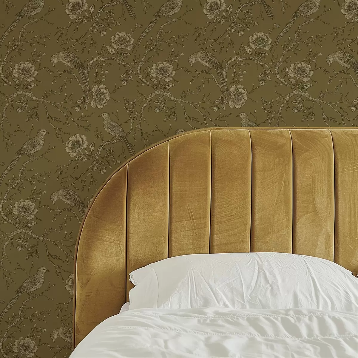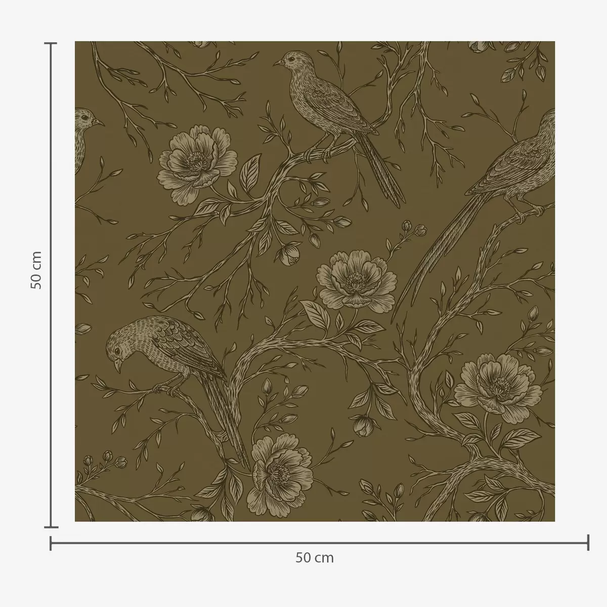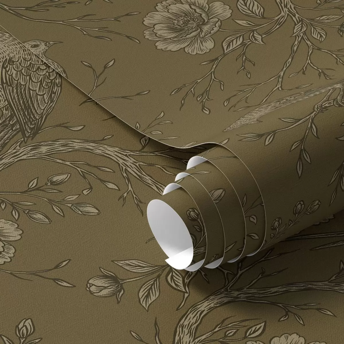 Papel tapiz Aves y flores vintage sobre un cálido fondo oliva. Nr. a01022v1
