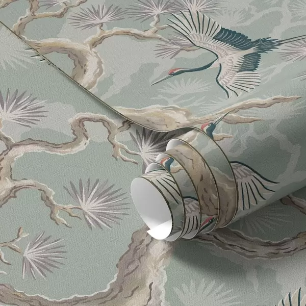 Papel tapiz Grullas entre ramas curvadas sobre un suave fondo color salvia. Nr. a01023