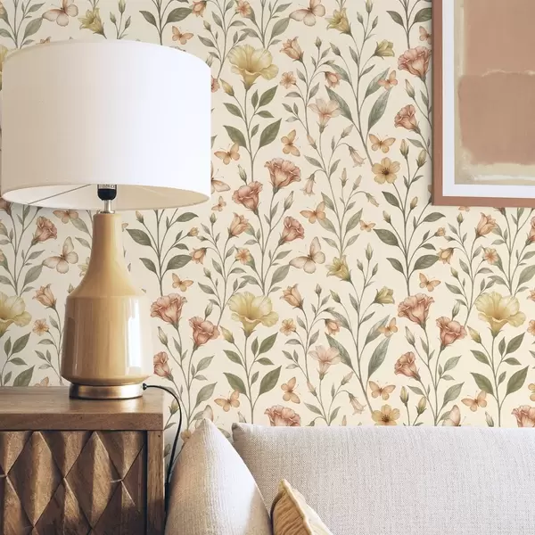 Papel pintado Delicadas flores de melocotonero y mariposas sobre un cálido fondo color crema a01026